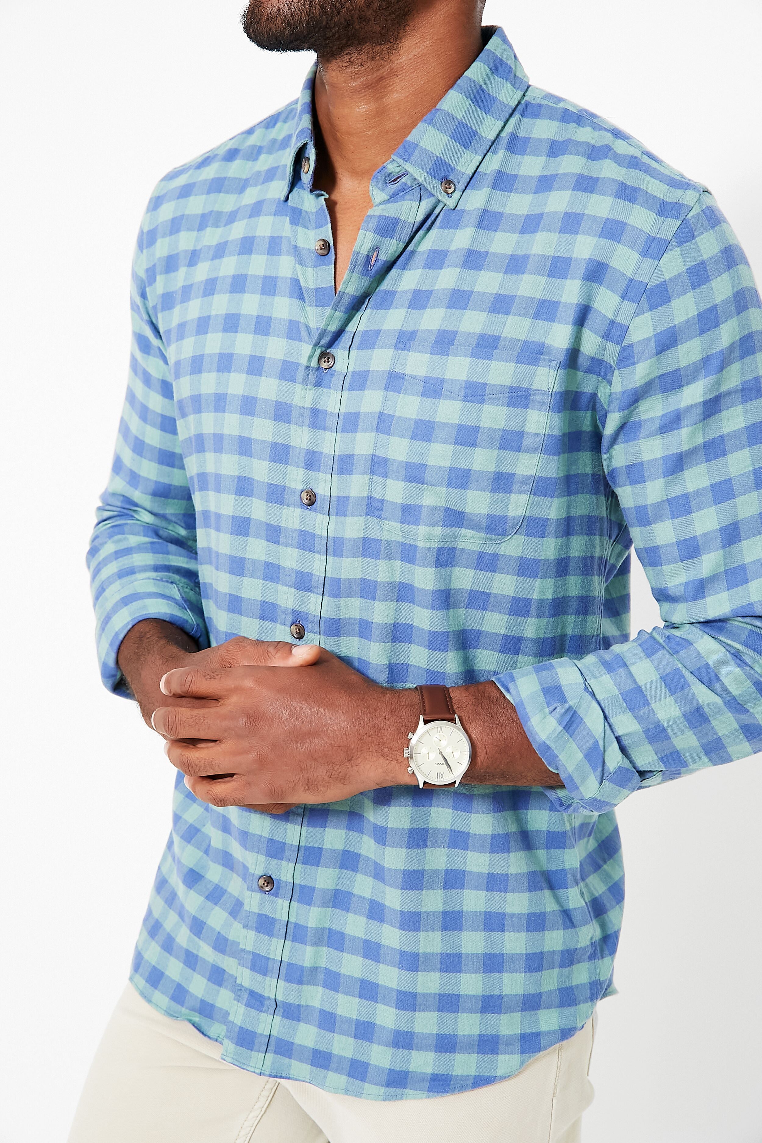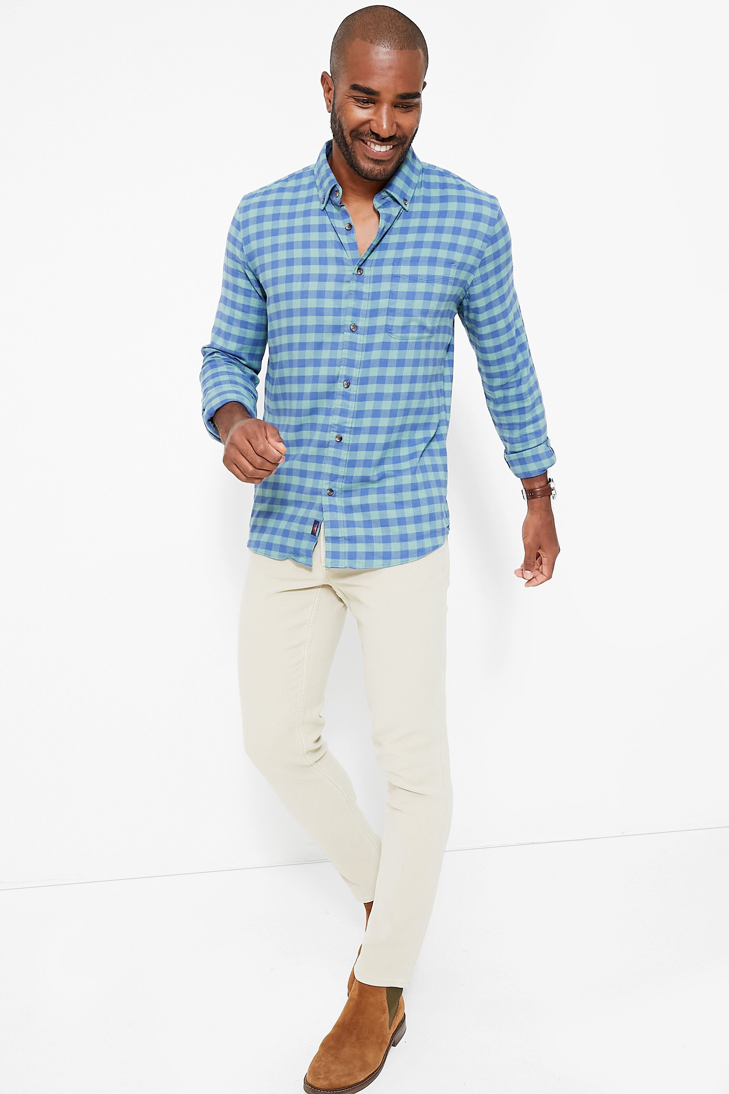 The Moss Cove Gingham All Time Shirt was designed to be the ultimate do-everything top with a special blend of luxurious fibers crafted for year-round wear. Like a flannel but more airy and stretchy. this piece features a spread collar. front button placket. and shirttail hem. Casual enough for the bar yet polished enough for the office. we are styling this easy silhouette with khaki pants and loafers for a classic look.