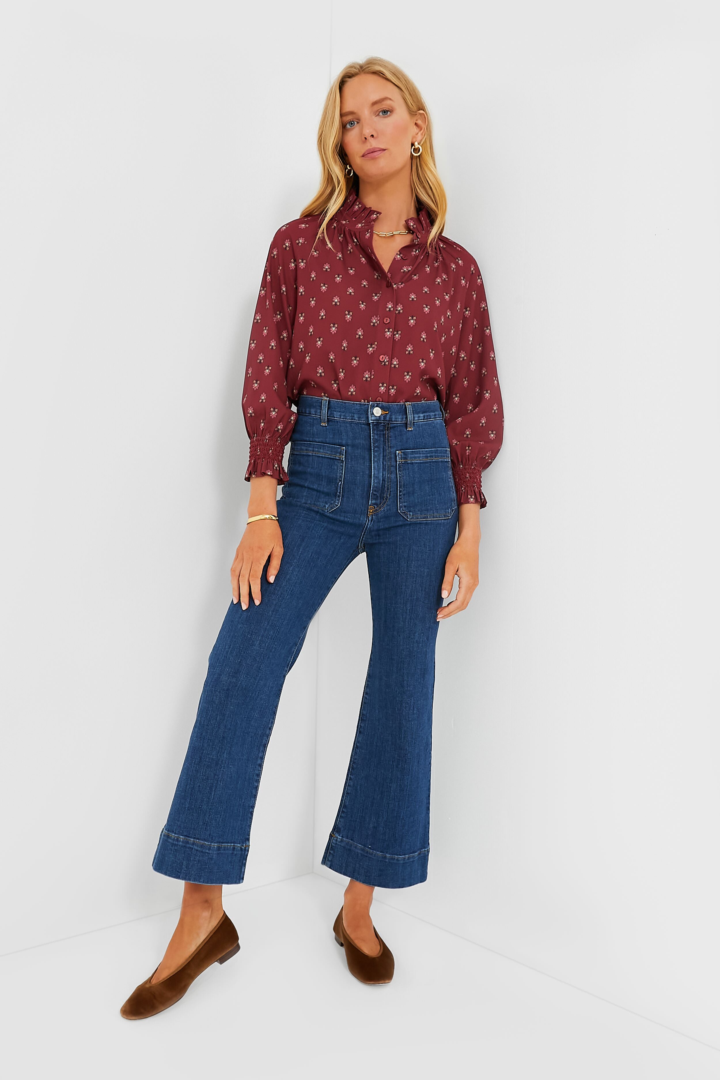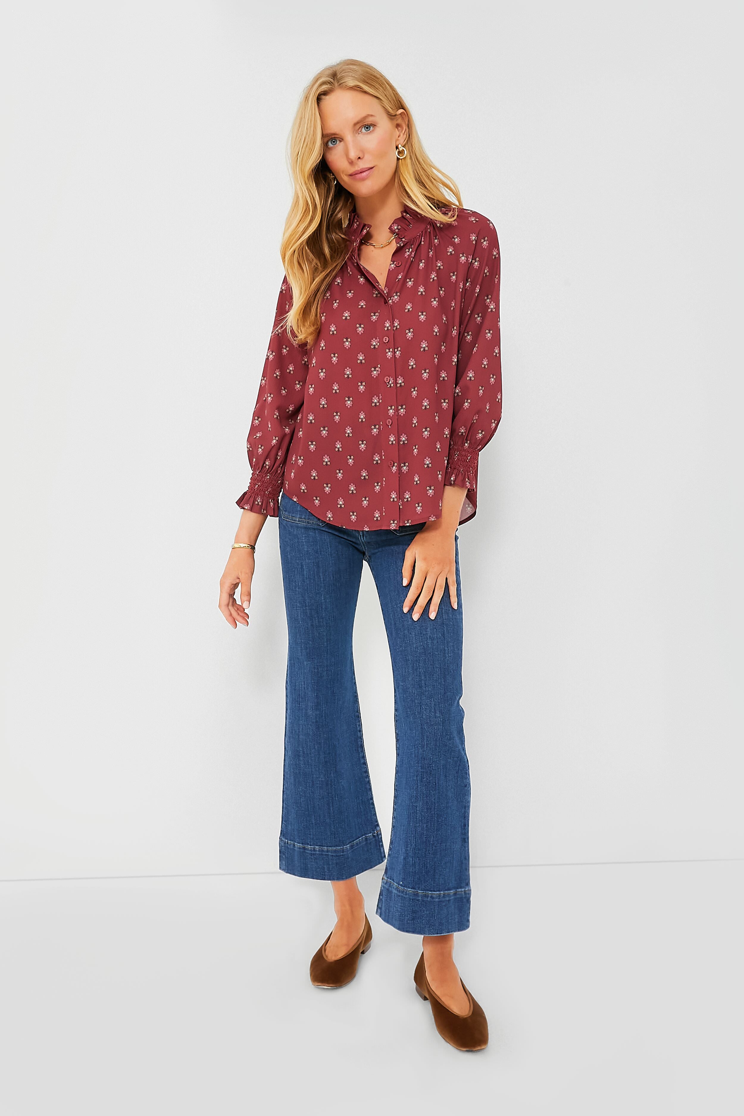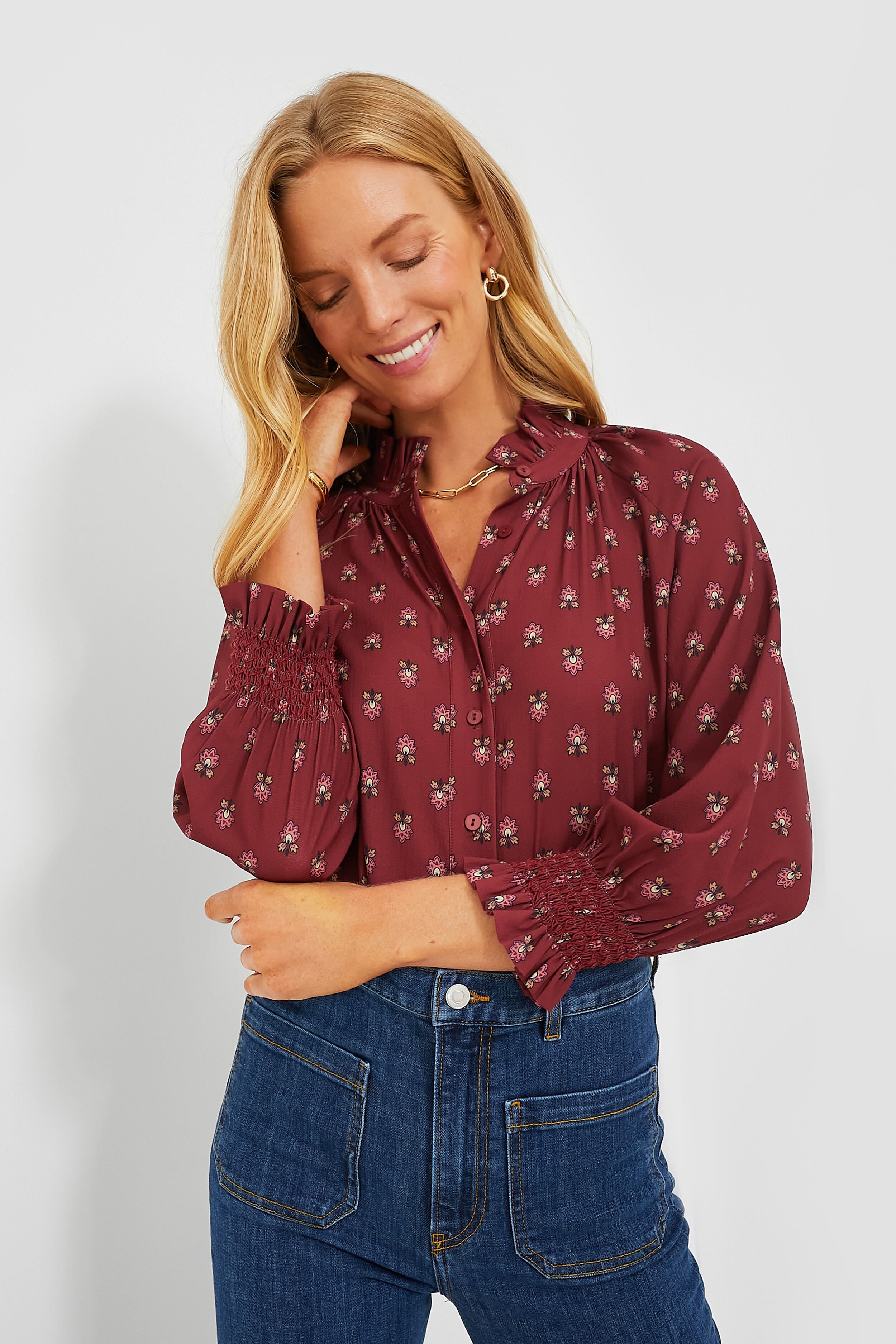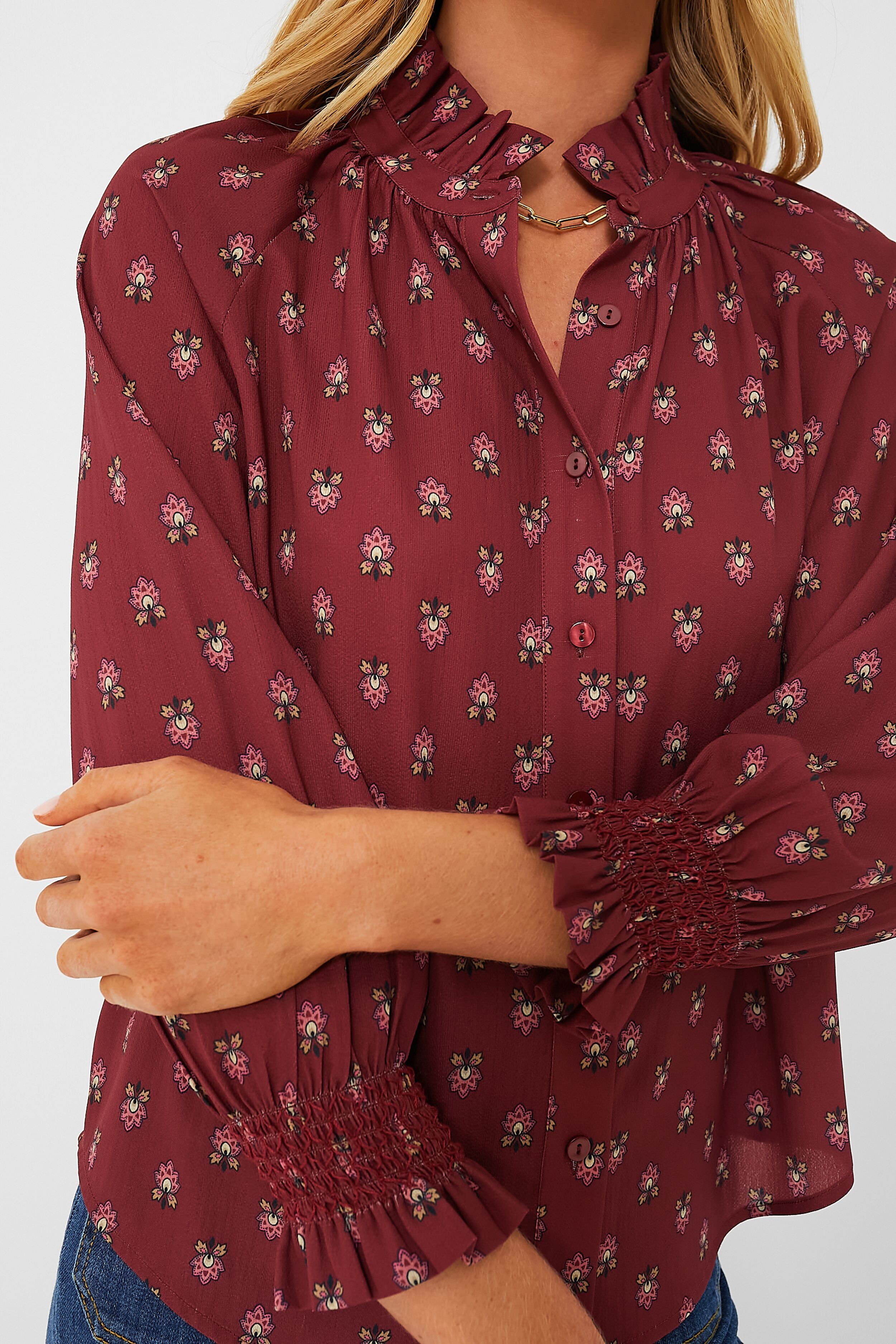 Effortlessly chic. the Mulberry Half Drop Schuyler Blouse takes everything we love about a classic button down and elevates it with fun. feminine details. Featuring a high neck ruffle collar. full placket button front. and a length that can easily be tucked in or left out. we are loving this versatile number all year long. In a breathtaking and subtly elegant maroon hue. this sweet silhouette pairs well with jeans and sneakers for daytime. or a mini skirt and boots for dining out with friends!