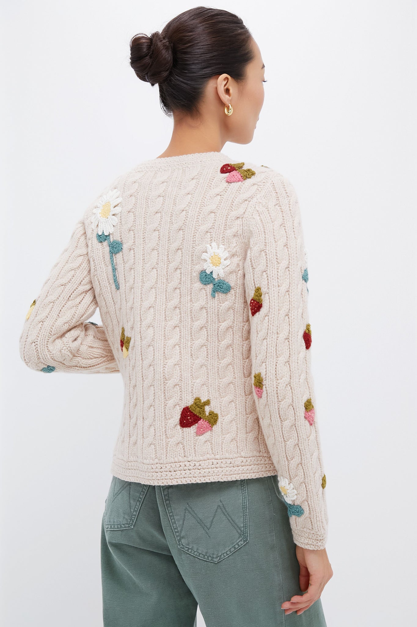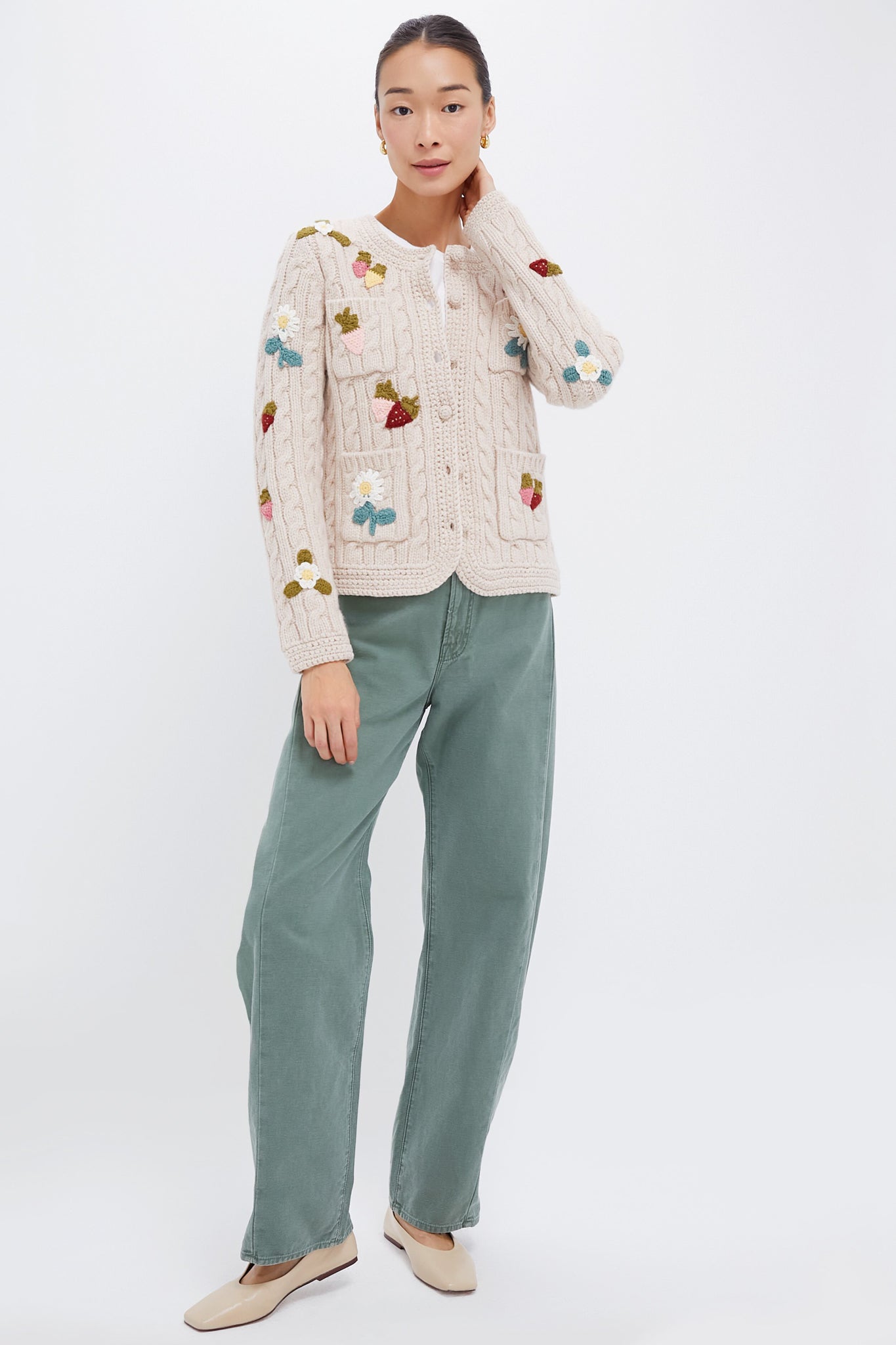 Whimsy. yet charming the Multi Callie Cardigan features playful fruit and floral crochet applique on a chunky cable knit evoking idyllic countryside vibes. We are already planning to wear it with jeans on a cozy day spent baking. or ayer it over a knit dress for a bonfire hangout by the lake.
