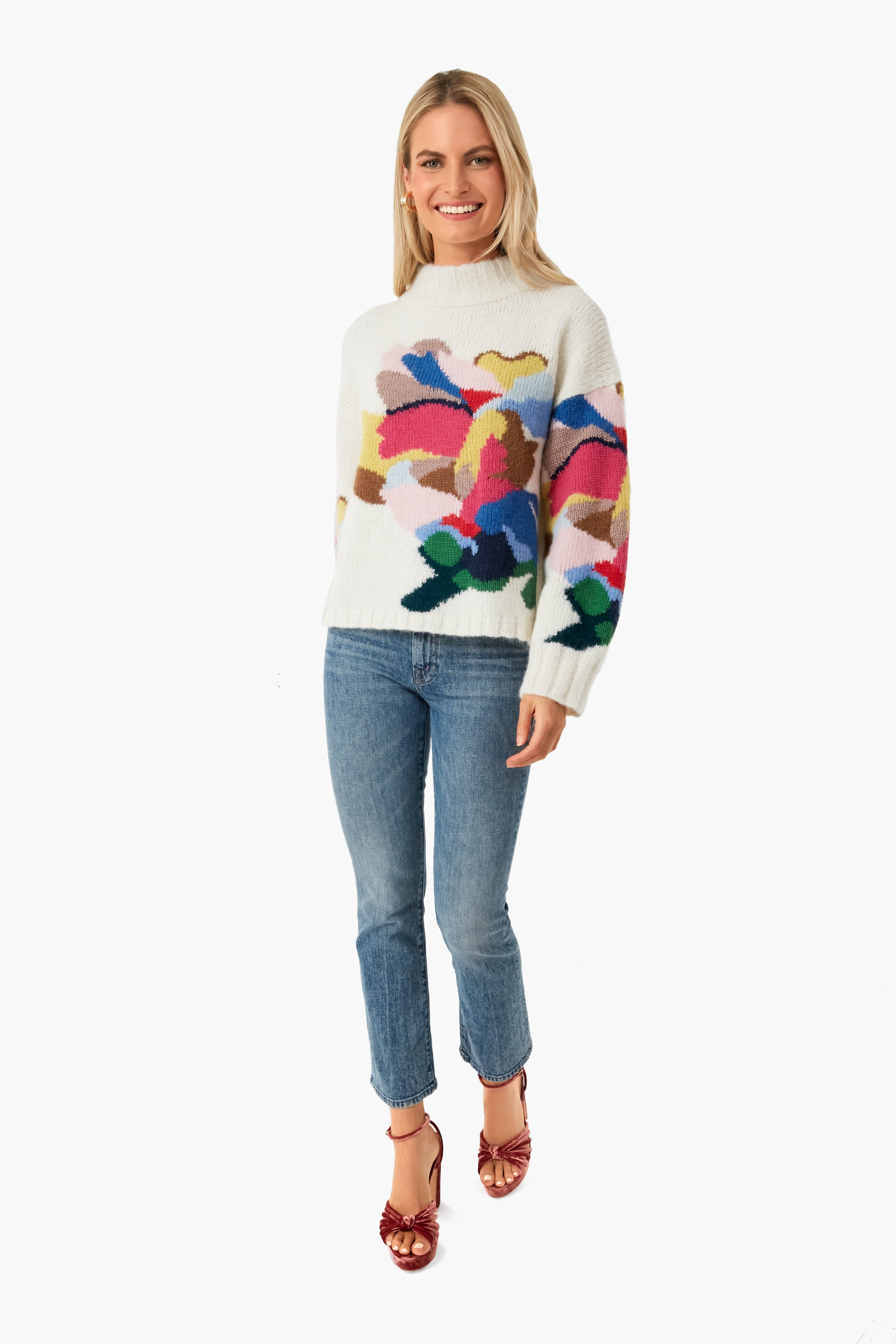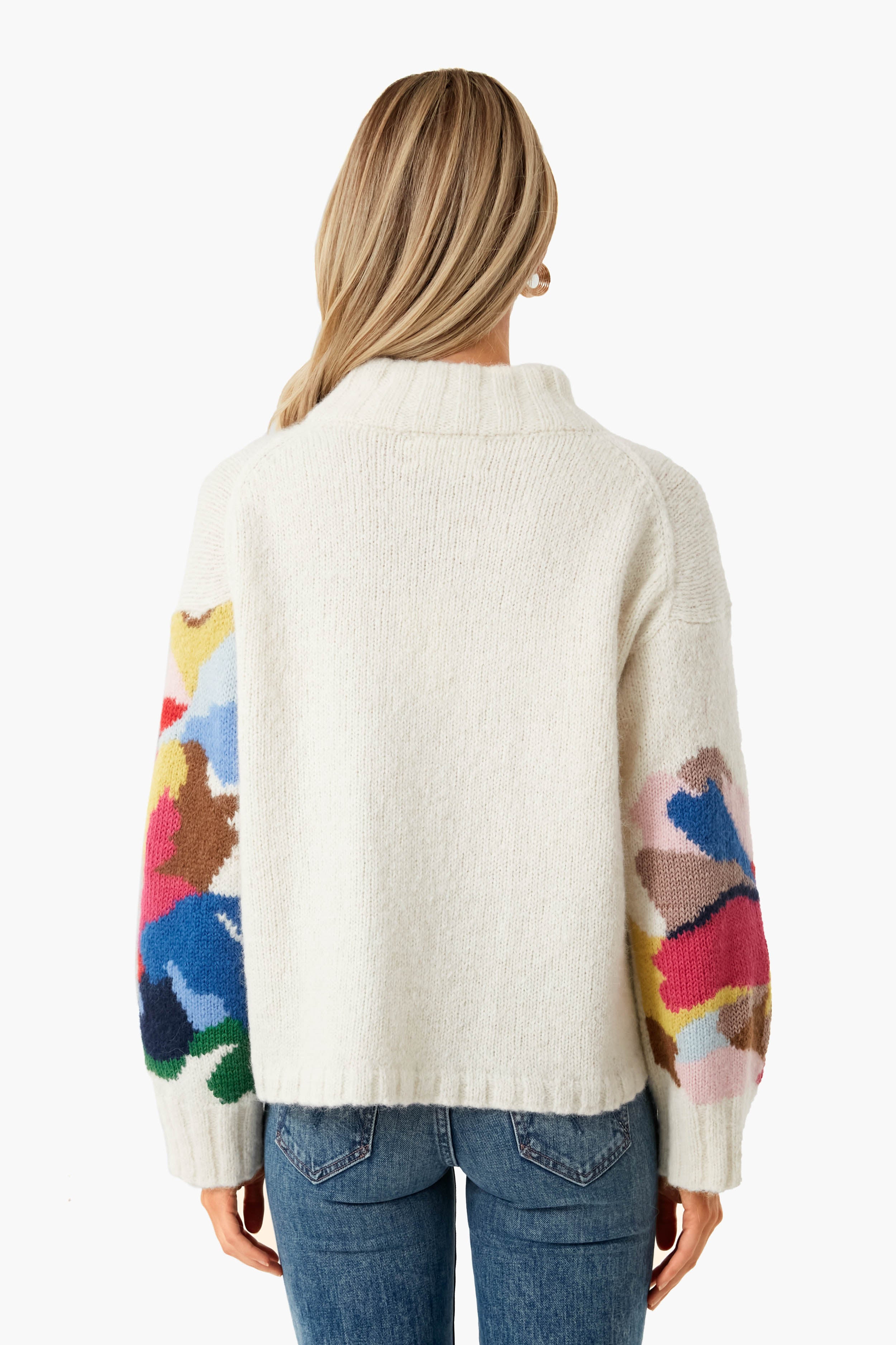 The Multi Dana Sweater is inspired by artist Dana McClure and her abstract floral artworks. This silhouette has a relaxed fit with a mock neck and wide sleeves. as well as side slits that make this piece super cozy. Ethically made from soft Peruvian alpaca yarn to be a wearable art piece that you can cocoon in. we love wearing this to read a book by the fire. or meet friends for hot toddies.