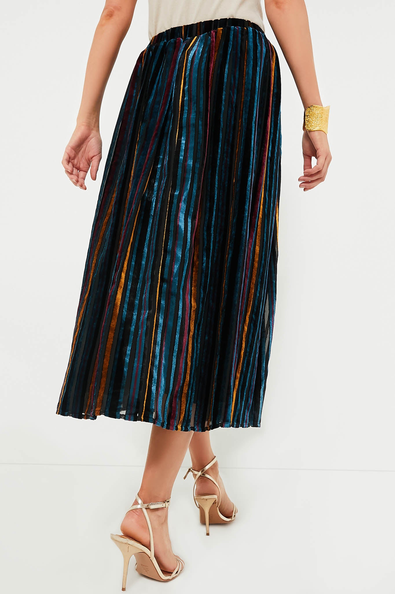 The Alba Skirt is like nothing in your closet- with a sheer black overlay with colorful velvet stripes and an elastic waistband. this midi is as striking as it is easy. Pair with a black bodysuit and heels or a turtleneck and boots!