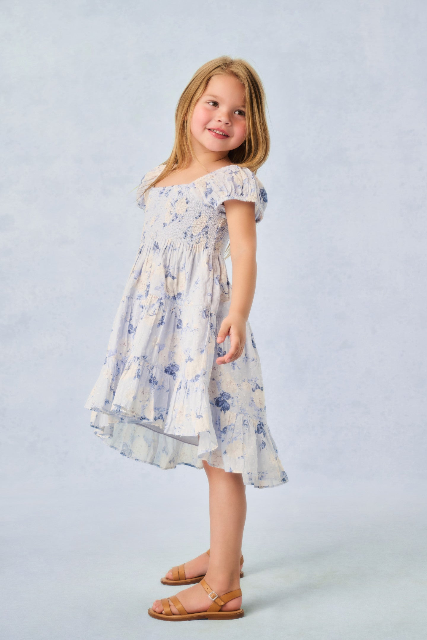 The Muriella returns to match your Go Chicly fragrance. In our new dreamy floral prints. this dress features sweet flutter sleeves. a smocked top falling to a three-tiered skirt with ruffles throughout and an asymmetrical hem.
