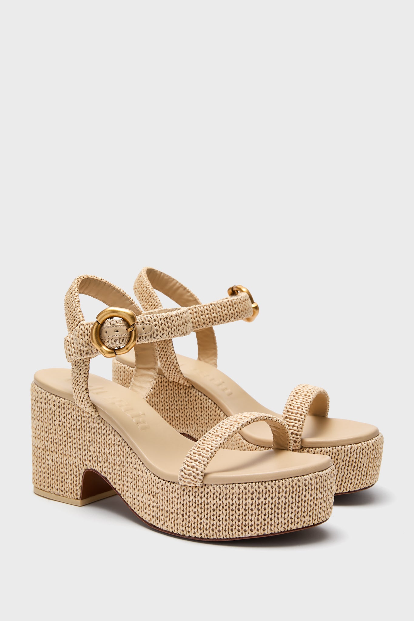 The Natural Clara Platforms are fashioned out of knitted raffia with a gold-toned abstract buckle detail. Perfect for breezy days spent at brunch with friends or shopping around town. we are styling this with a vibrant maxi or flirty mini skirt.