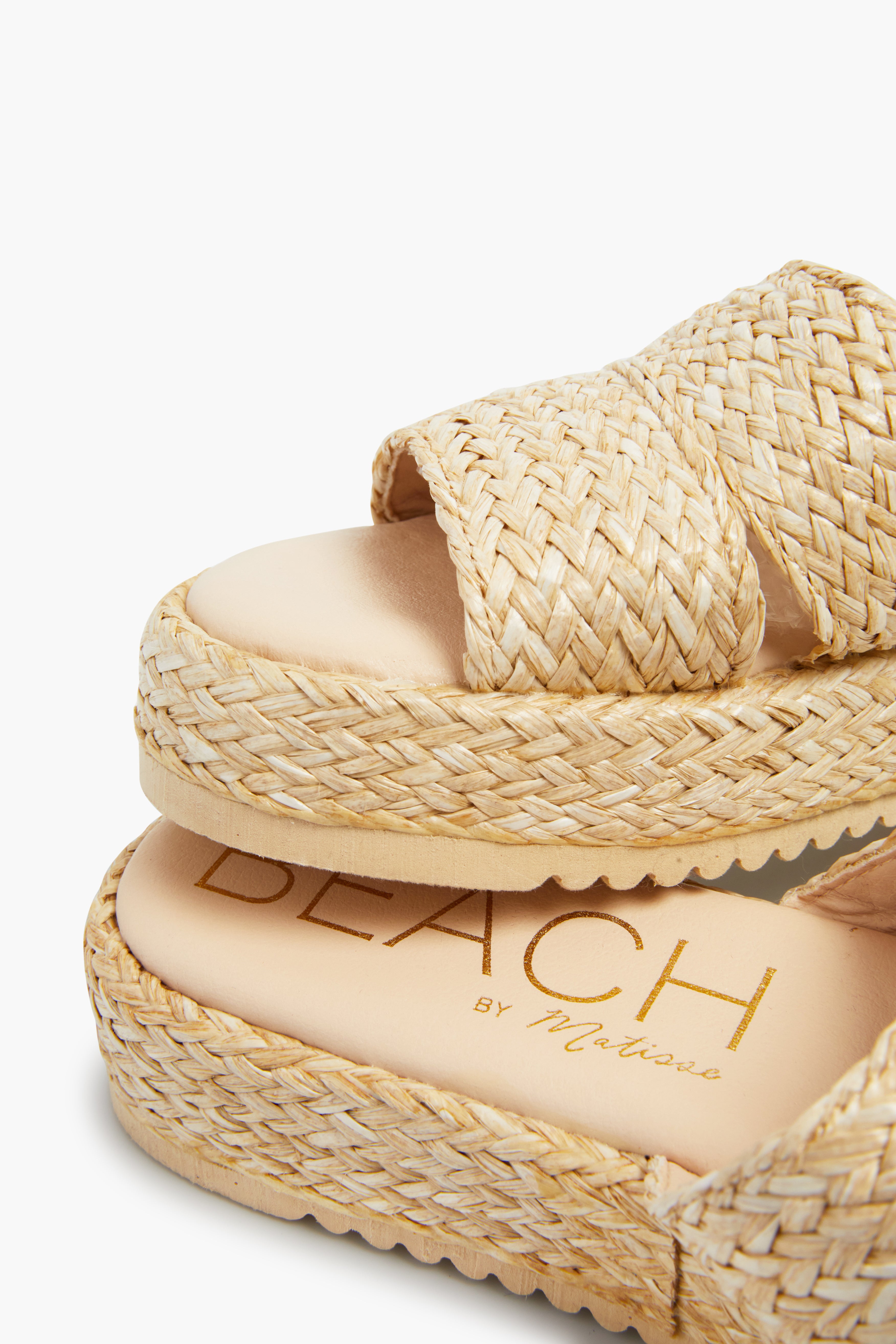 - Material: Raffia (upper). Synthetic (lining. sole)