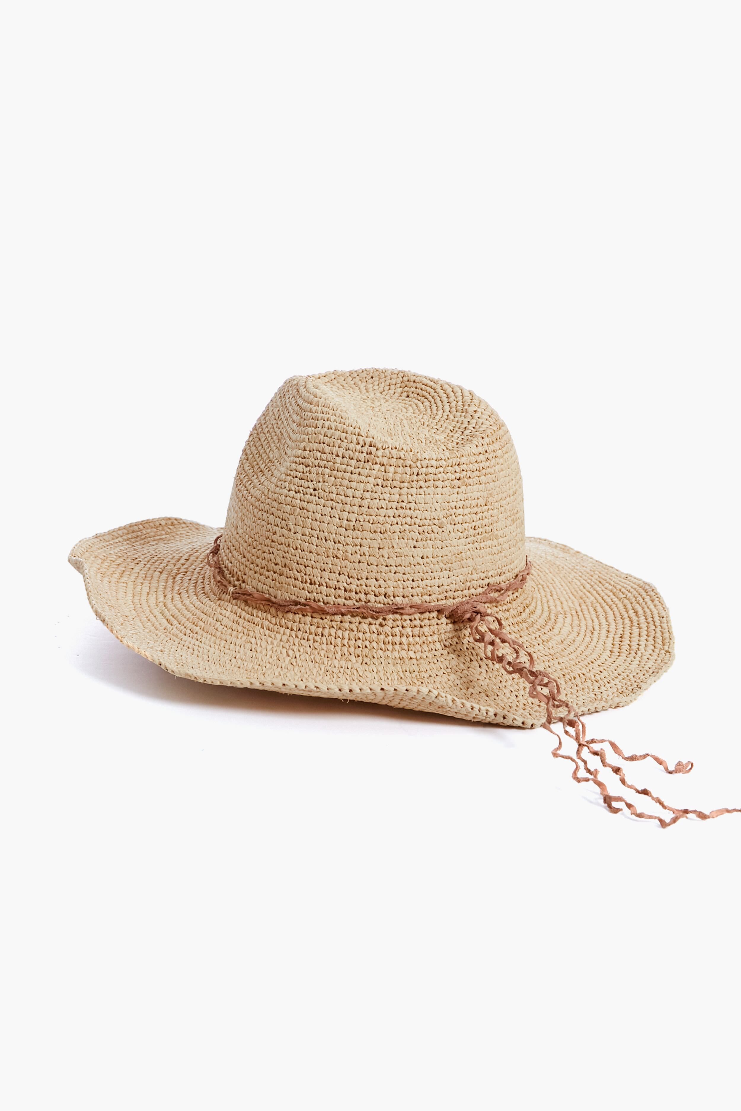 Versatile as it is chic. the Natural Mika Hat is a necessity for sunny days this season. Constructed out of crocheted raffia with a leather cord adorning the brim to give a hint of rustic. sun-seeking style. this fedora silhouette will keep you protected from the sun without sacrificing your look.