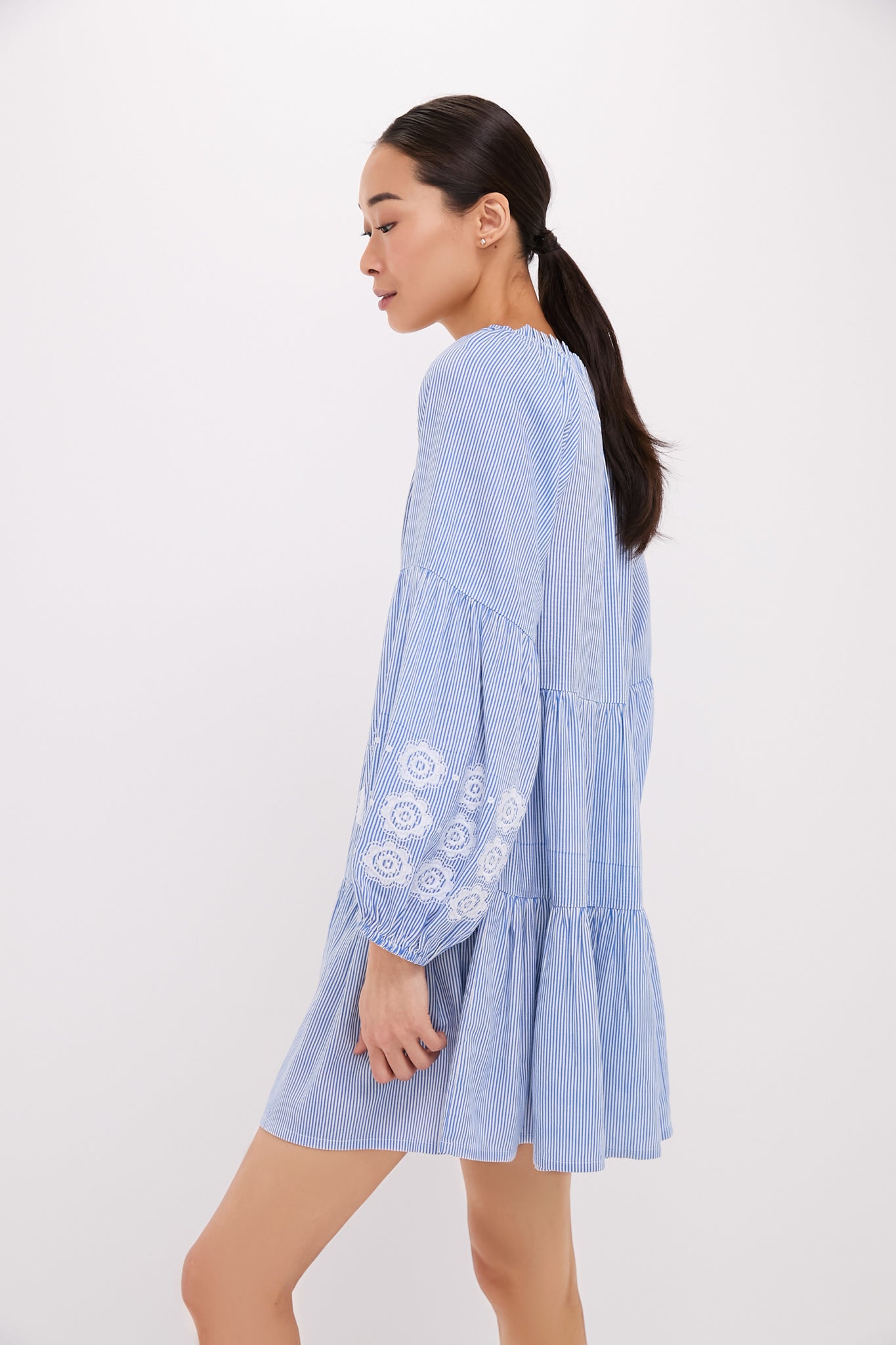 The Nautical Stripe Sea Breeze Coverup is the perfect piece for warm weather escapes and weekend getaways. With a ruffled collar and tassel ties that embody bohemian style. and embroidered detailing throughout as well as a light and breezy feel. this is the piece you will want to throw on in the morning and keep on all day. zero thought required. Pair with sandals and sunnies for poolside sips. or with wedges and gold hoops to dress it up for dinnertime.