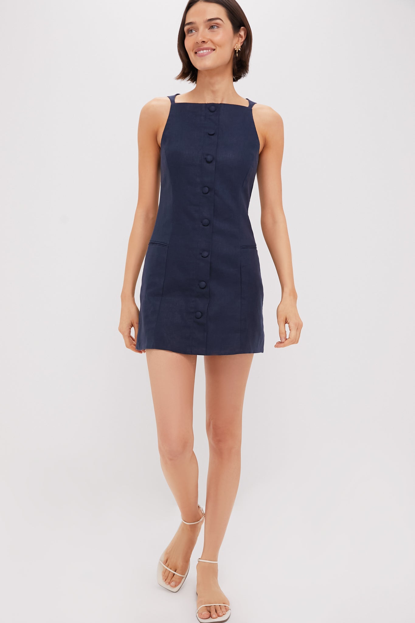 The Navy Ambra Dress is a softly structured style with a high square neckline. mock front buttons. and a tailored silhouette that chinches slightly at the waist before leading into a soft A-line skirt. We are styling this look with an oversized blazer and loafers. or with ballet flats and a shoulder bag.