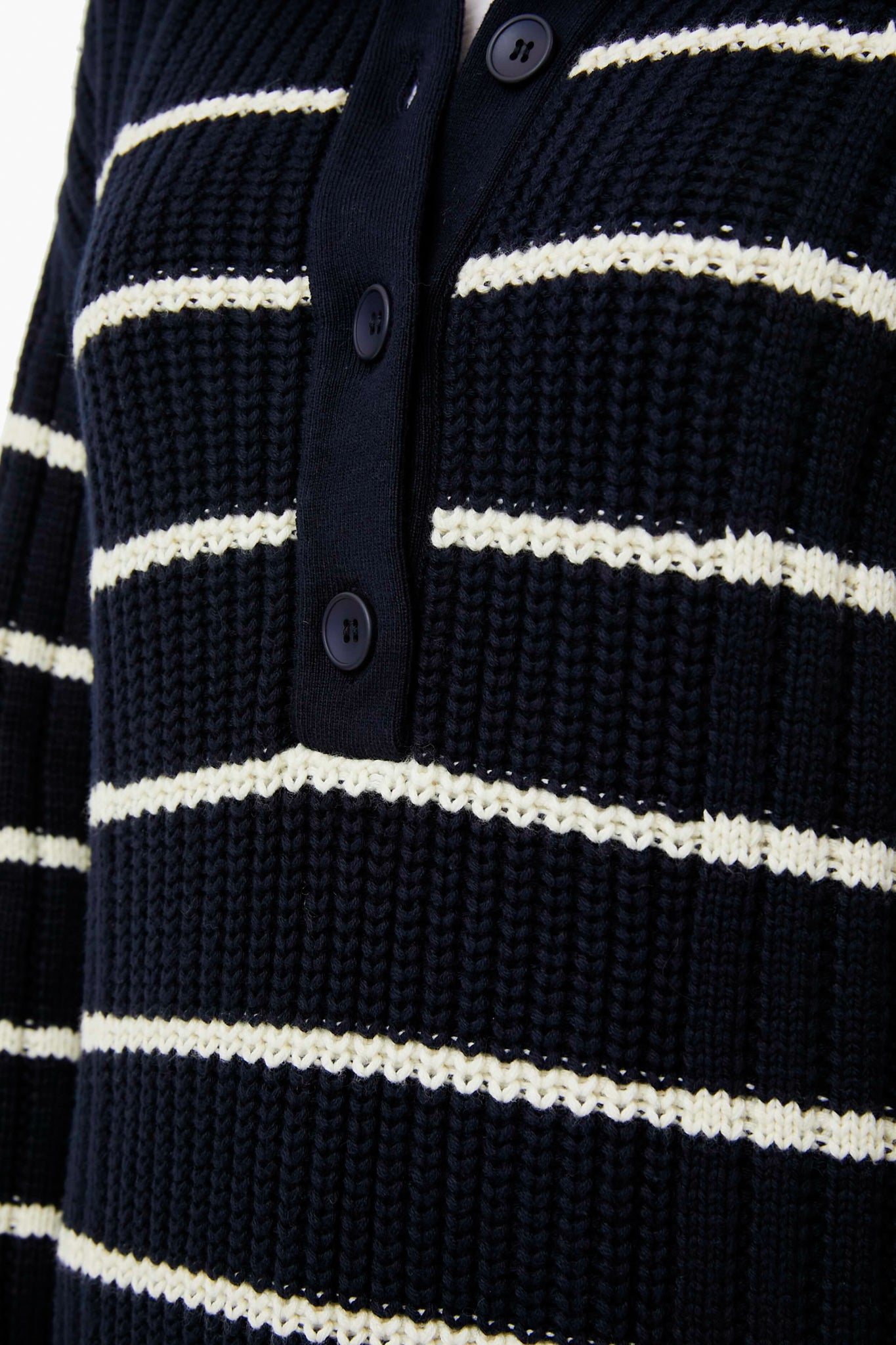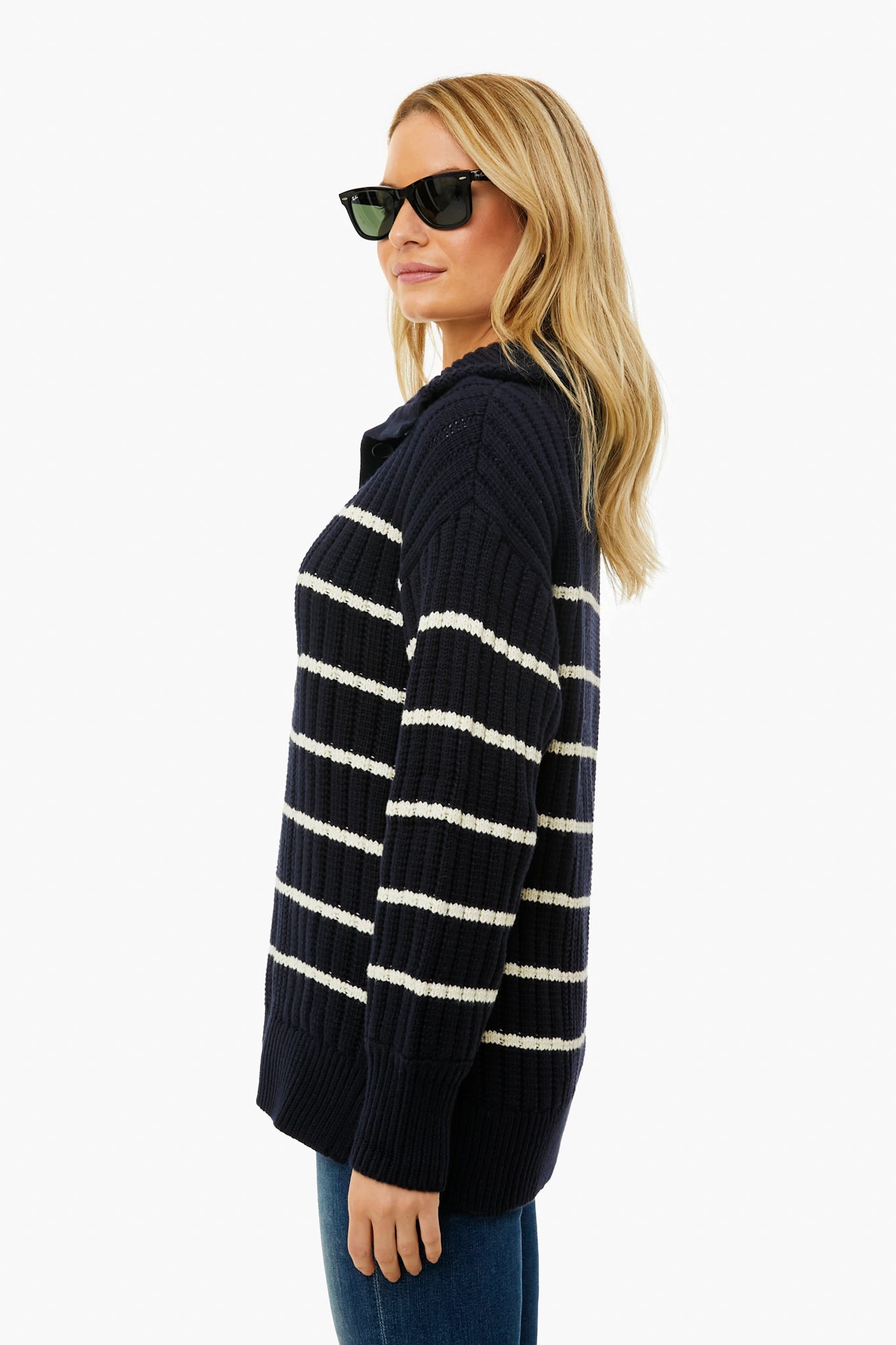 The Navy and Cream Paloma Sweater is a wardrobe staple crafted from a soft cashmere and organic cotton blend. Featuring a relaxed silhouette. this style has a 3-button placket. flat collar. and drop shoulders. Pair with denim while reading in your favorite local coffee shop.