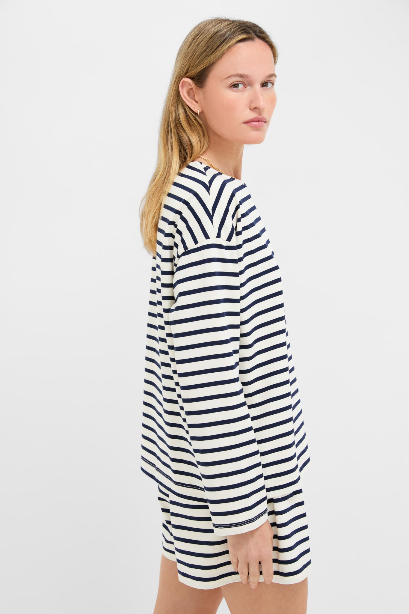 A classic style staple for year-round wear. we love the Navy and Ivory Stripe Knit Odie Tee for its soft fabric. boxy shape. and slightly round hem. A flattering fit that can be worn hundreds of ways. we are styling this with the coordinating Navy and Ivory Stripe Knit Olympia Short. sneakers. and sunnies for weekend farmers market runs. park play dates. or whatever other activities are on your agenda.