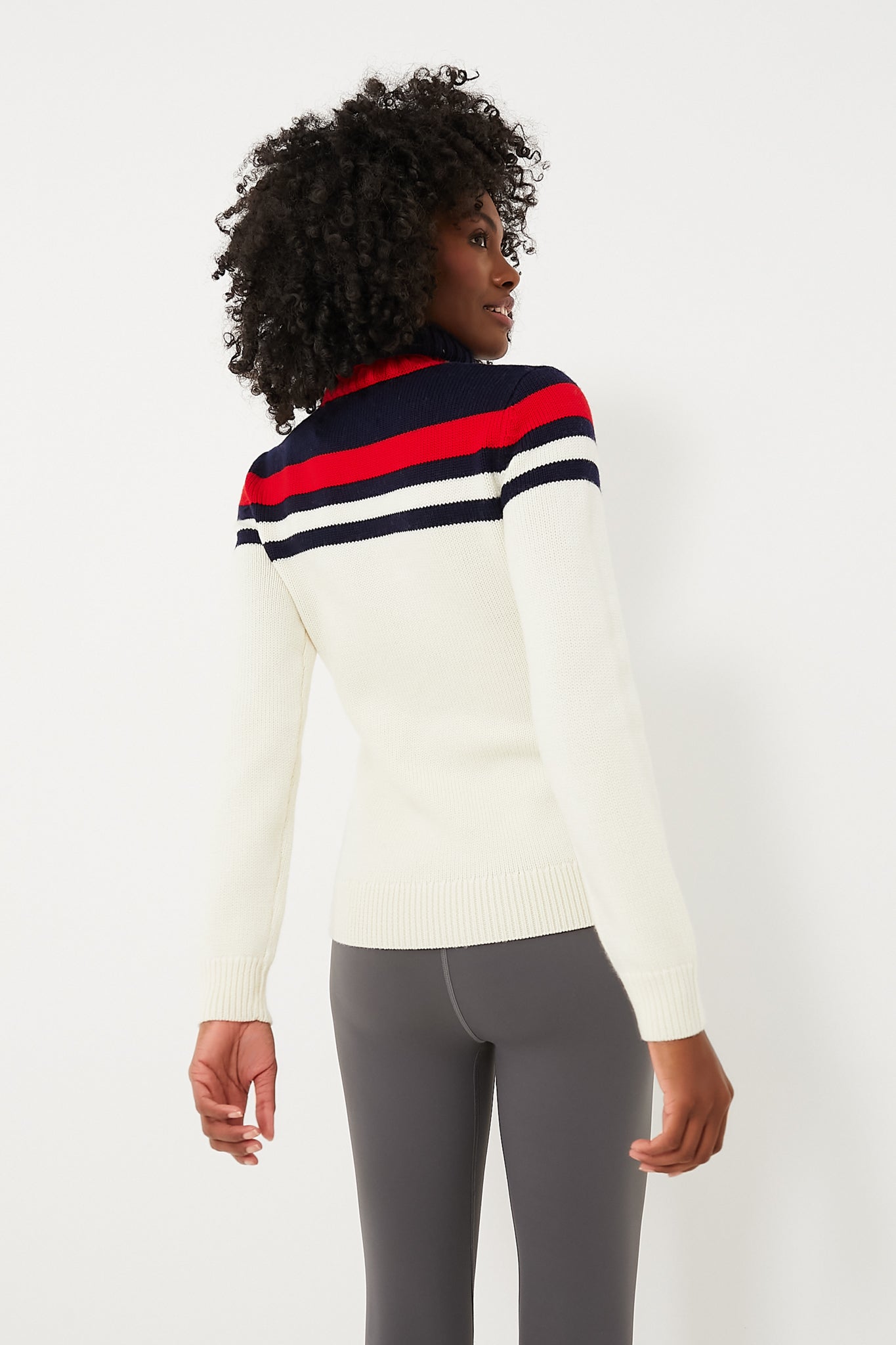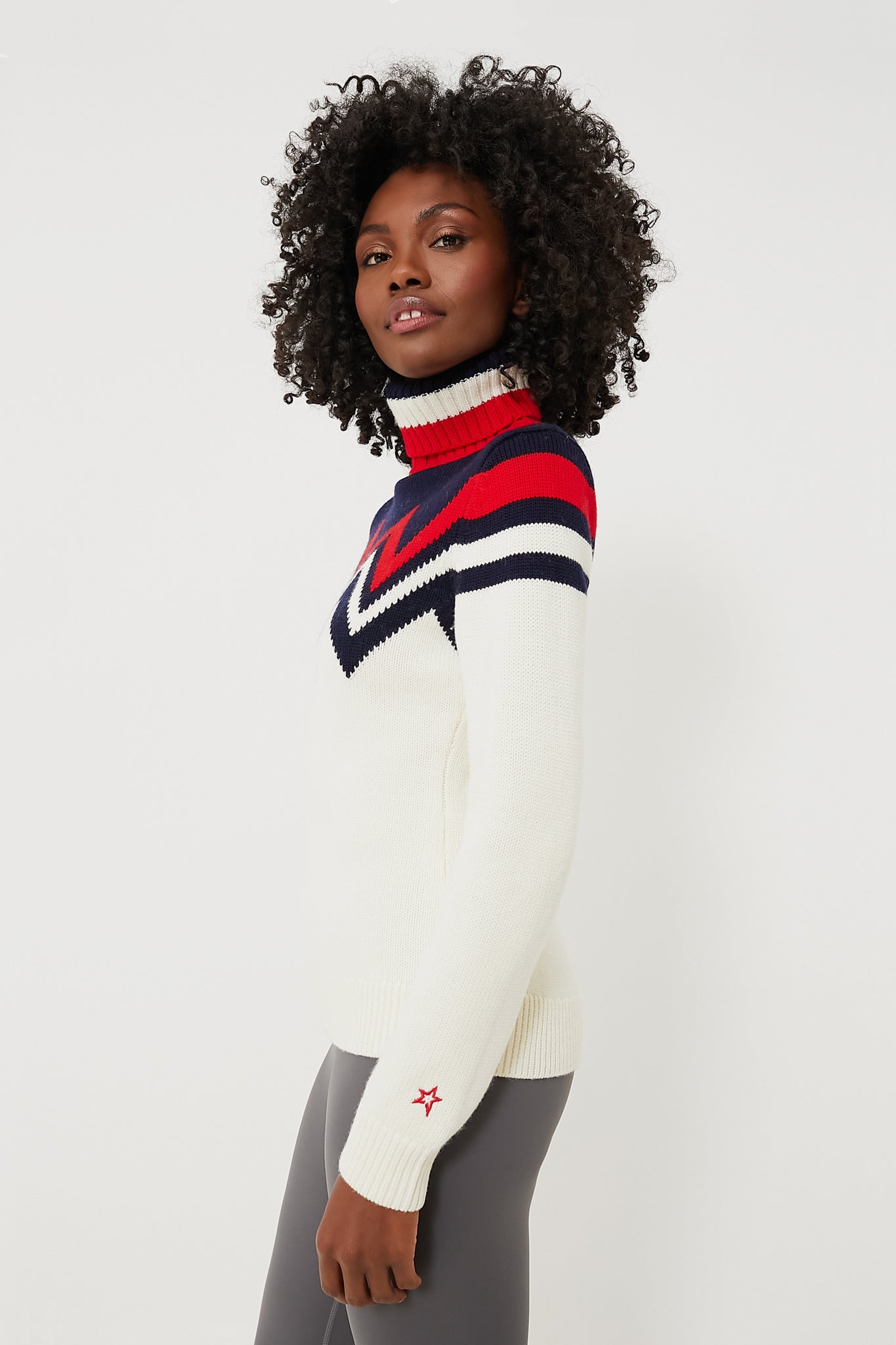 The iconic Navy and Snow White Alpine Sweater is crafted with 100% Merino wool with a retro zigzag design that will stand you out from the crowd. It can be used as a layering piece under your jacket or for snuggling at home. Pair with denim. boots. and a beanie for the perfect après-ski look.