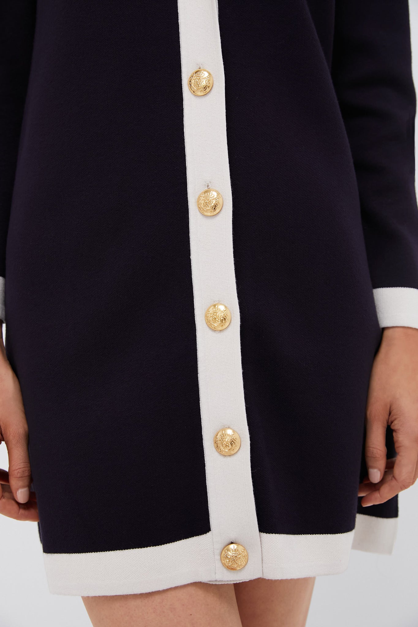 Crafted from a mid weight knit in a chic and classic navy. the Liv Cardigan offers a simple yet flattering silhouette with contrast color finishes and crested buttons. Lean into the vintage vibe by pairing this with the matching Navy and White Trim Knit Marie Dress. flats. and a bucket bag or style with a white tank. flared jeans. and a metallic shoe!