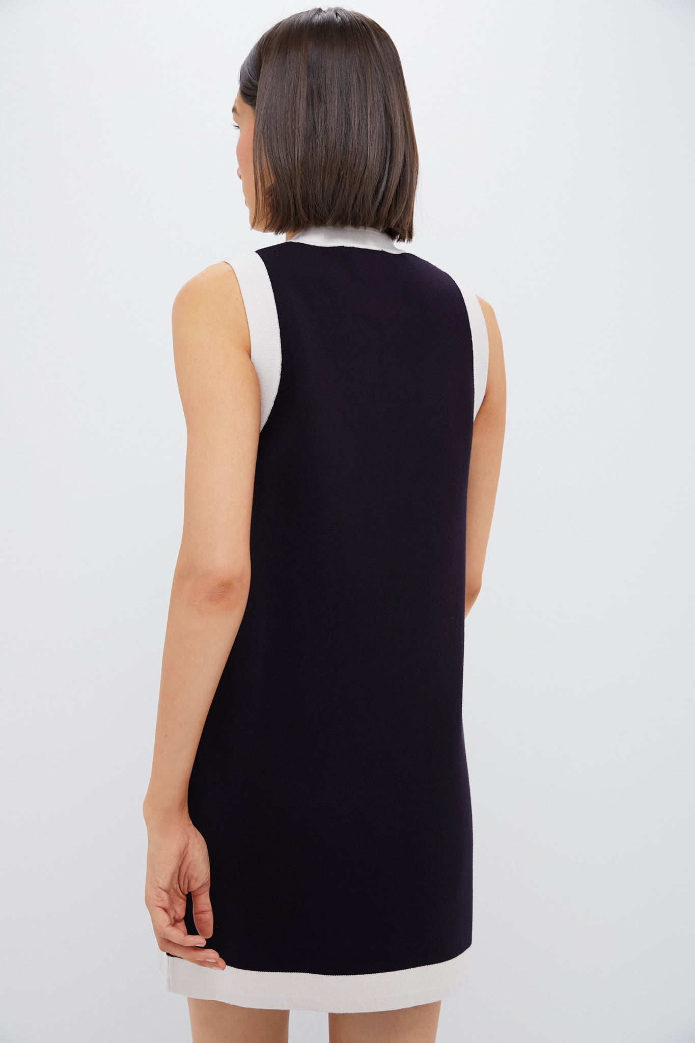 Crafted from a mid weight knit in a classic navy blue hue. the Marie Dress offers a simple yet flattering silhouette with contrast white finishes. Lean into the vintage vibe by pairing this with the matching Navy and White Trim Knit Liv Cardigan. flats. and bucket bag for a chic ensemble!