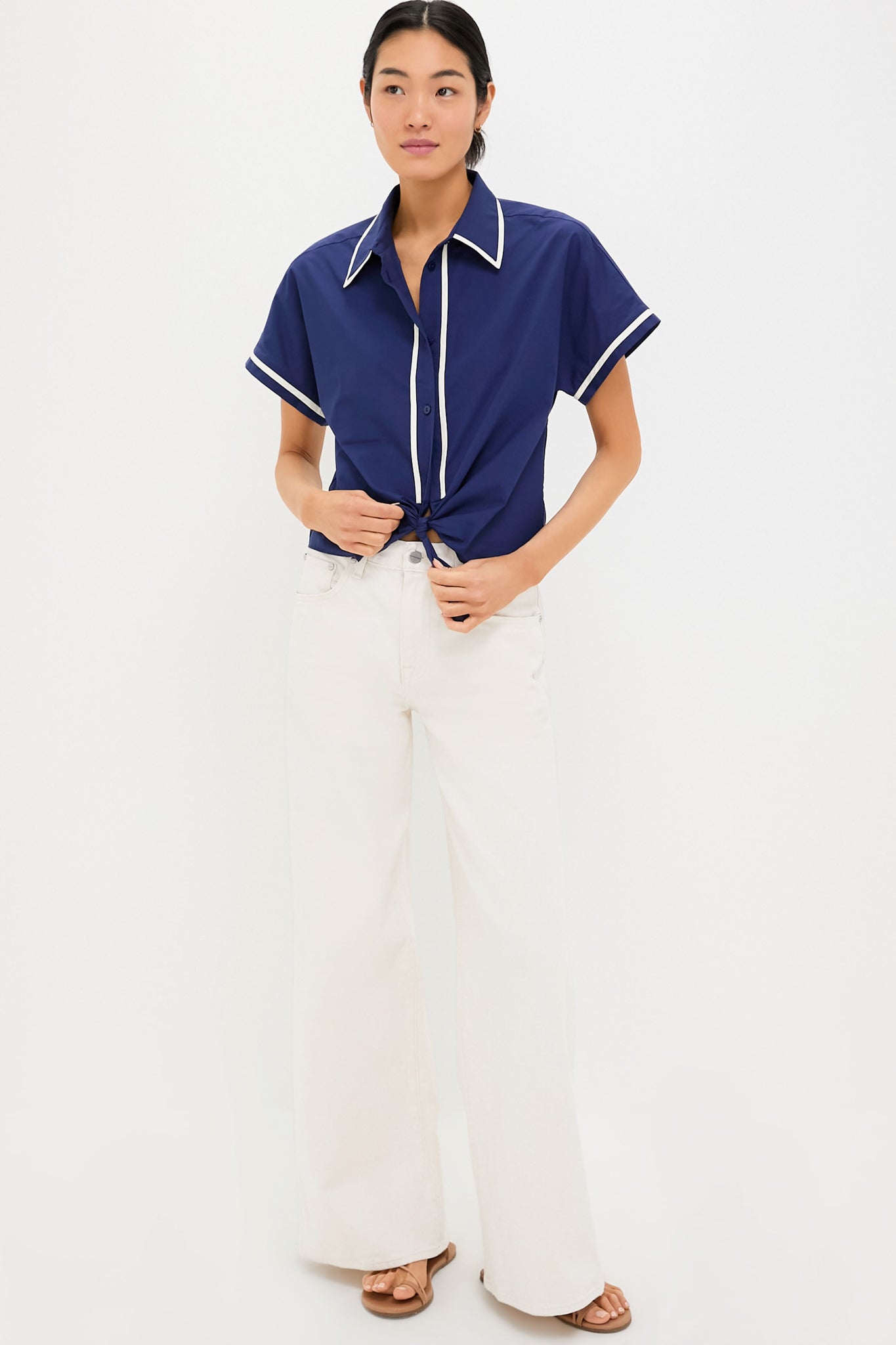 The Navy and White Trimmed Connor Blouse is a classic top with a fun twist! This piece features a spread collar. center button placket. and self-tie detail. making it easy to style with a million ways to be worn. Pair with your favorite pair of white denim. sandals. and sunnies for springtime weather or with shorts on hot days!