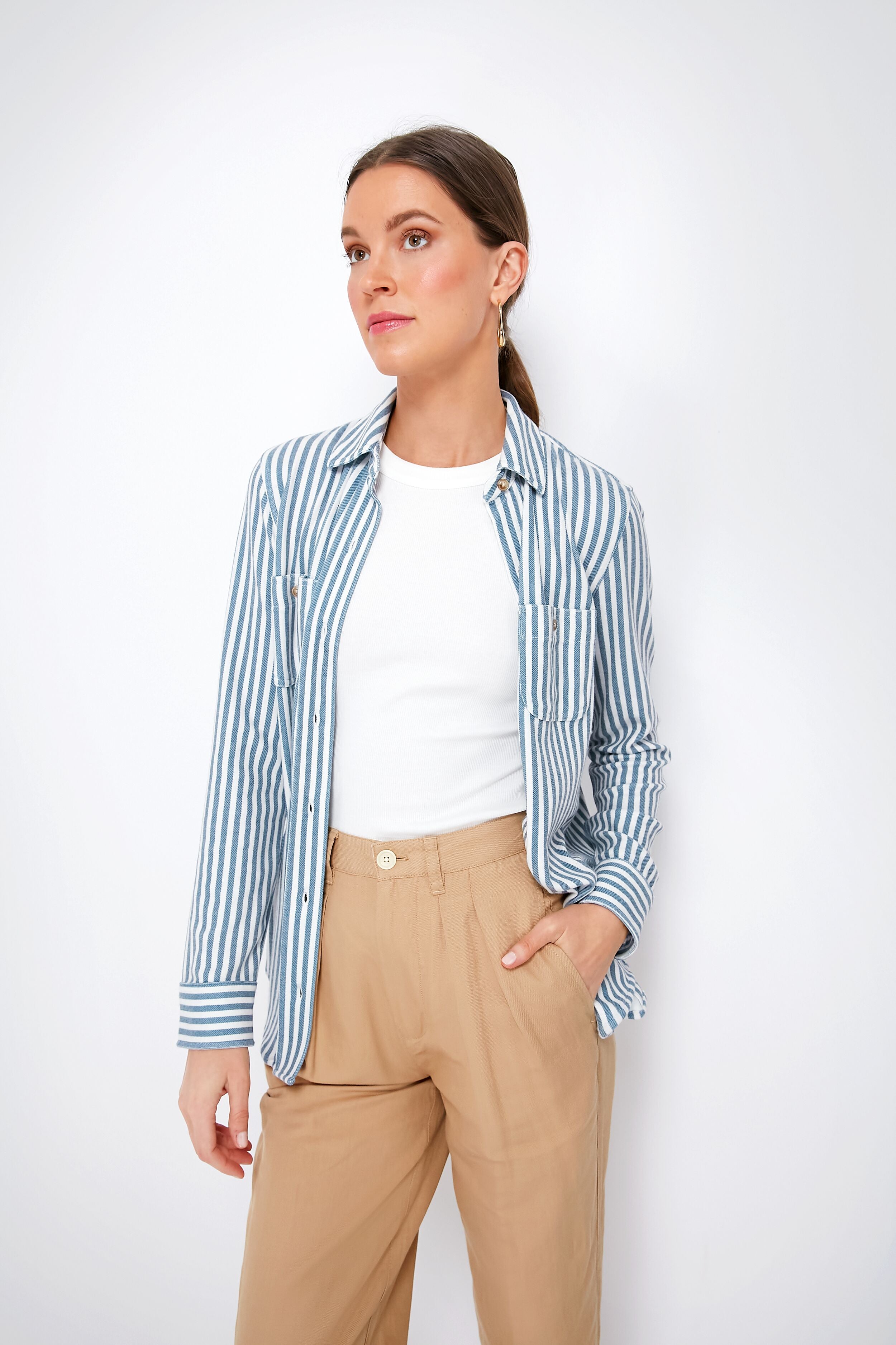 The Navy Blazer Stripe Legend Sweater Shirt is our ultimate transitional top that works across seasons. Halfway between a cozy sweater and a classic button down. this silhouette is a new classic with its spread collar. front placket. and patch pocket details. So soft and slightly stretchy. you know you will want to wear this everyday — buttoned up or undone over a tee. with trousers. denim. and shorts.