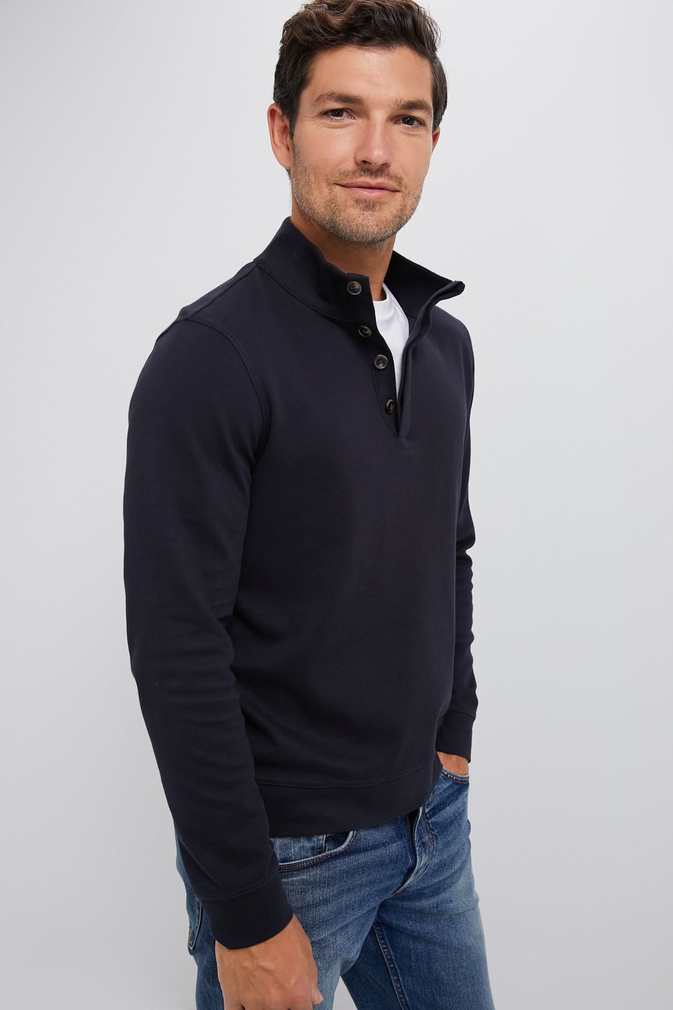An elevated closet staple made of soft cotton. this 'throw-on-and-go' sweater is a piece that can be both functional and comfortable. Made with versatility in mind. the collar buttons can be left open to catch a breeze during cool seasons or closed up for extra warmth. Dress it up with dark denim. or slip it on before an early morning jog for an effortlessly casual look.