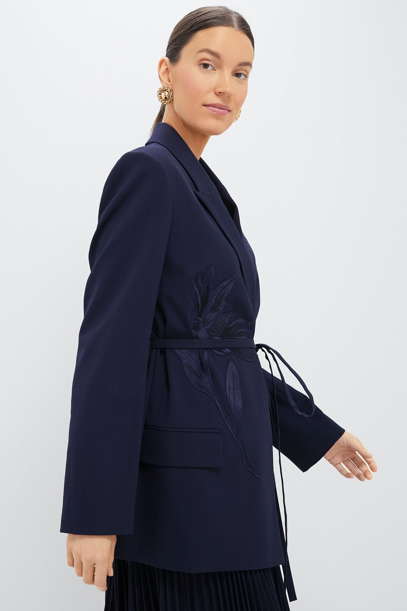At once tailored and relaxed. this double-breasted blazer is made from a soft wool blend twill and belted at the waist for a flattering silhouette. It is decorated with an elegant appliquéd daisy that adds subtle charm. making it a style that can be worn for countless occasions.
