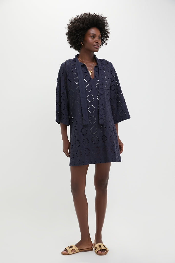 The Navy Eyelet Marseille Coverup is an effortlessly chic piece to add to your packing list. With a mini length. three quarter length sleeves. and neck ties. throw on over a bathing suit for stylish beach-to-bar look!