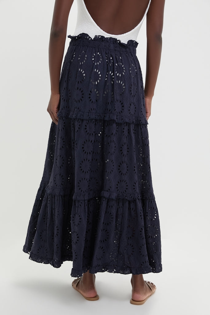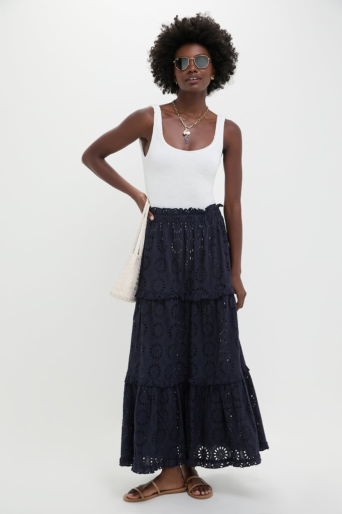 Twirl worthy with its tiered layers and ruffle detailing. the Navy Eyelet Prado Skirt slips on with minimal effort while bringing maximum style. This pull on maxi is a one step elevation to a casual look while keeping you ultra-chic. Pair with a bathing suit. sandals. and sunnies for a beach-chic look!