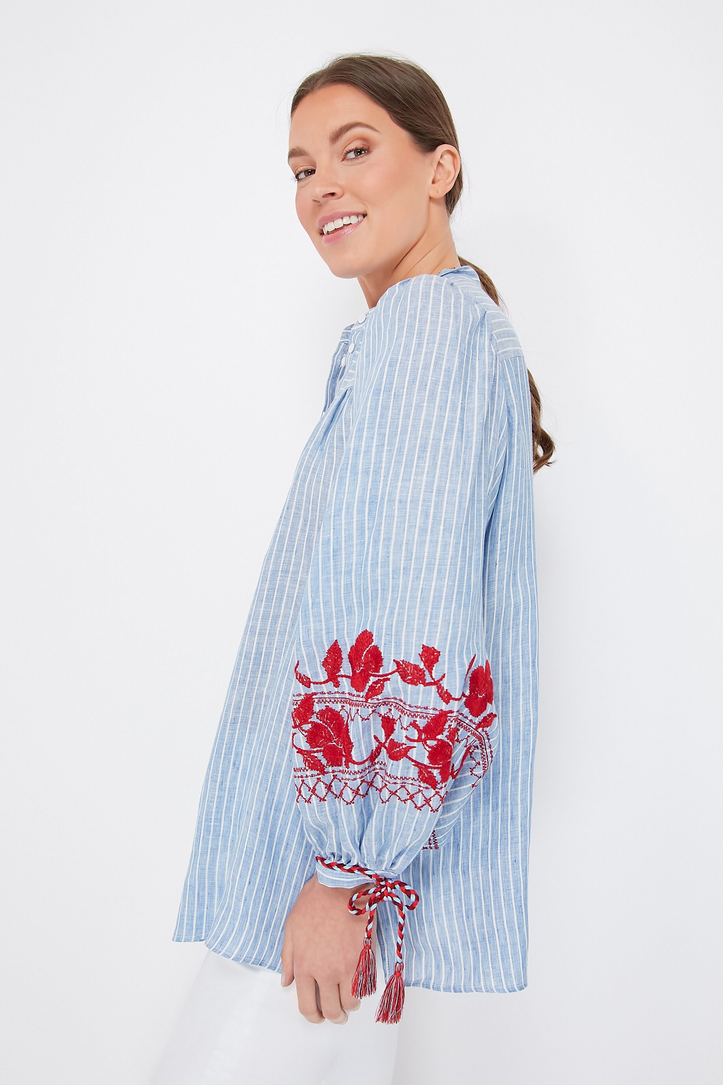 Talk about a statement top! The Navy Legno Blouse makes a real splash with its standout sleeves — a balloon shape. contrasting floral embroidery. and tassel ties all bring the flair. Bohemian-inspired details like a mandarin collar and a relaxed fit take a pinstriped button down to new heights. so we know you'll be excited about this stunning silhouette. Pair with white denim and sandals for a lowkey yet lovely look. or with a flowing maxi skirt and a raffia clutch to lean into beachy boho.