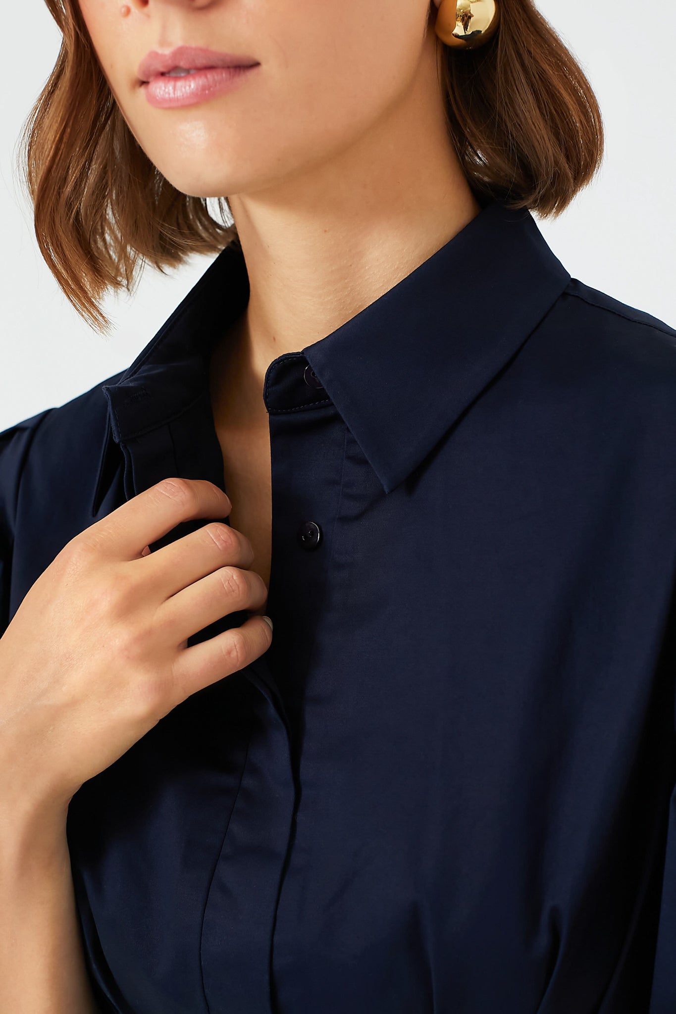 We've always loved the combination of a tailored shirt dress with feminine details to create a polished look that's fit for both work and play. The Navy Mini Delaney Dress features a spread collar. puff sleeves. and pleats at the waistline for a chic silhouette that is easy to wear for endless occasions. Opt for gold accessories and your favorite bag for a timeless look that'll effortlessly carry you from brunches to evening get-togethers with ease.