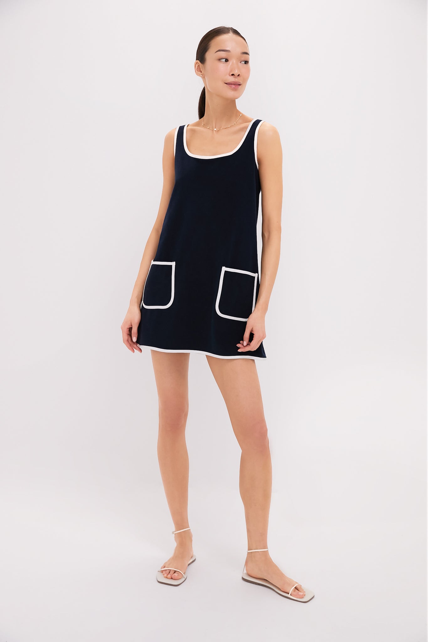 The Navy Mini Terrycloth Dress Coverup perfectly blends an adorable mini with a beach coverup. This shift silhouette features front patch pockets and a contrast trim that adds a chic touch. Pair with sandals and a crossbody for strolling around a beachside town. or wear over your suit with a sun hat to the pool!