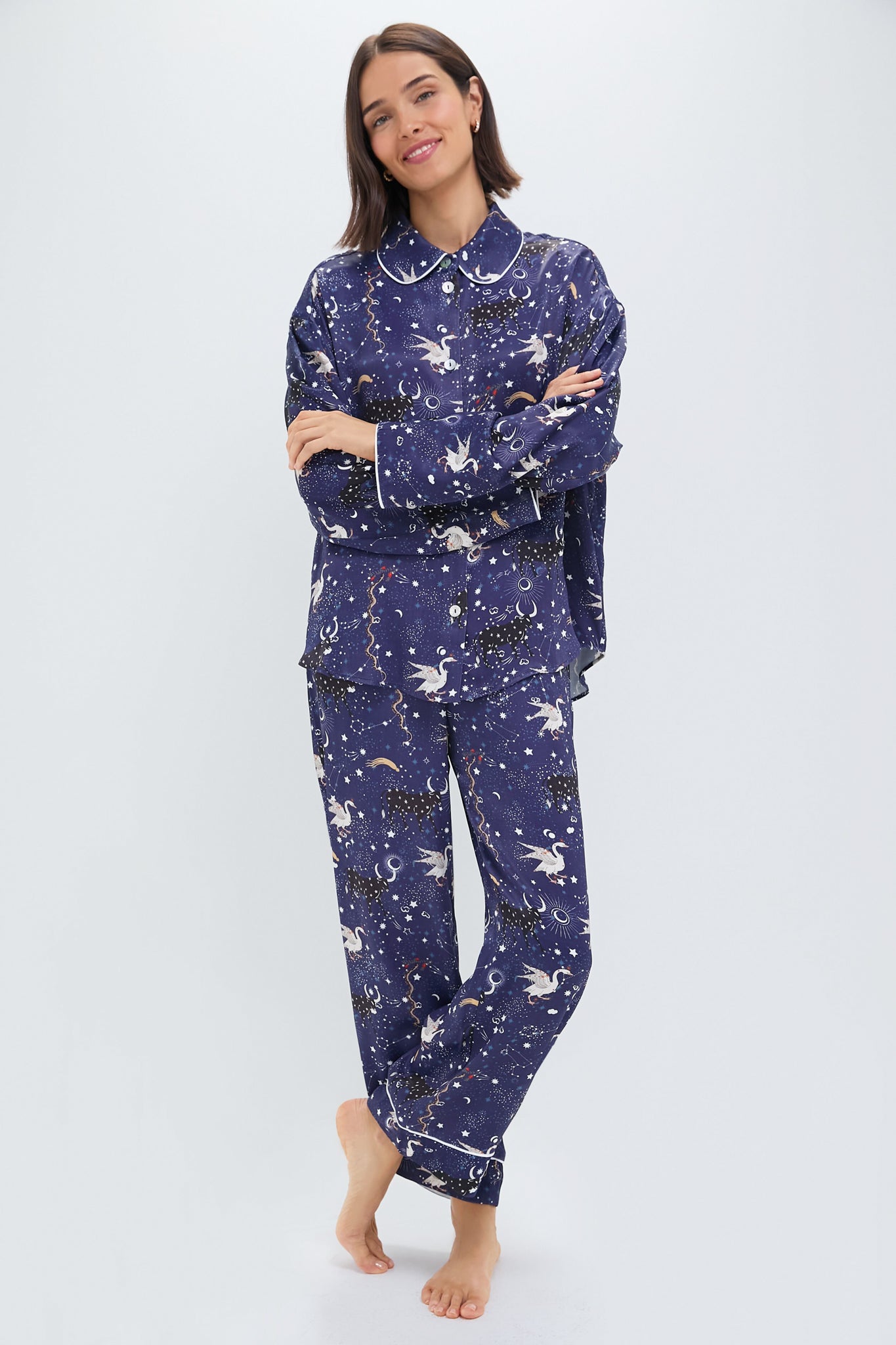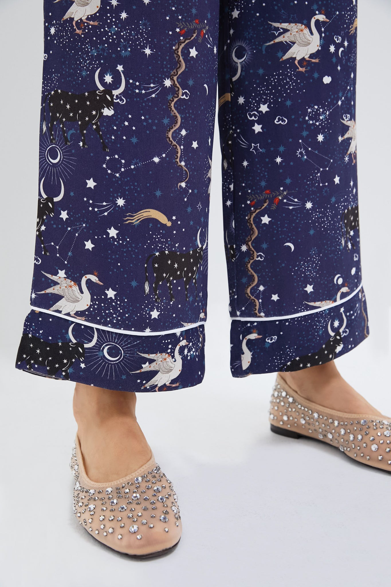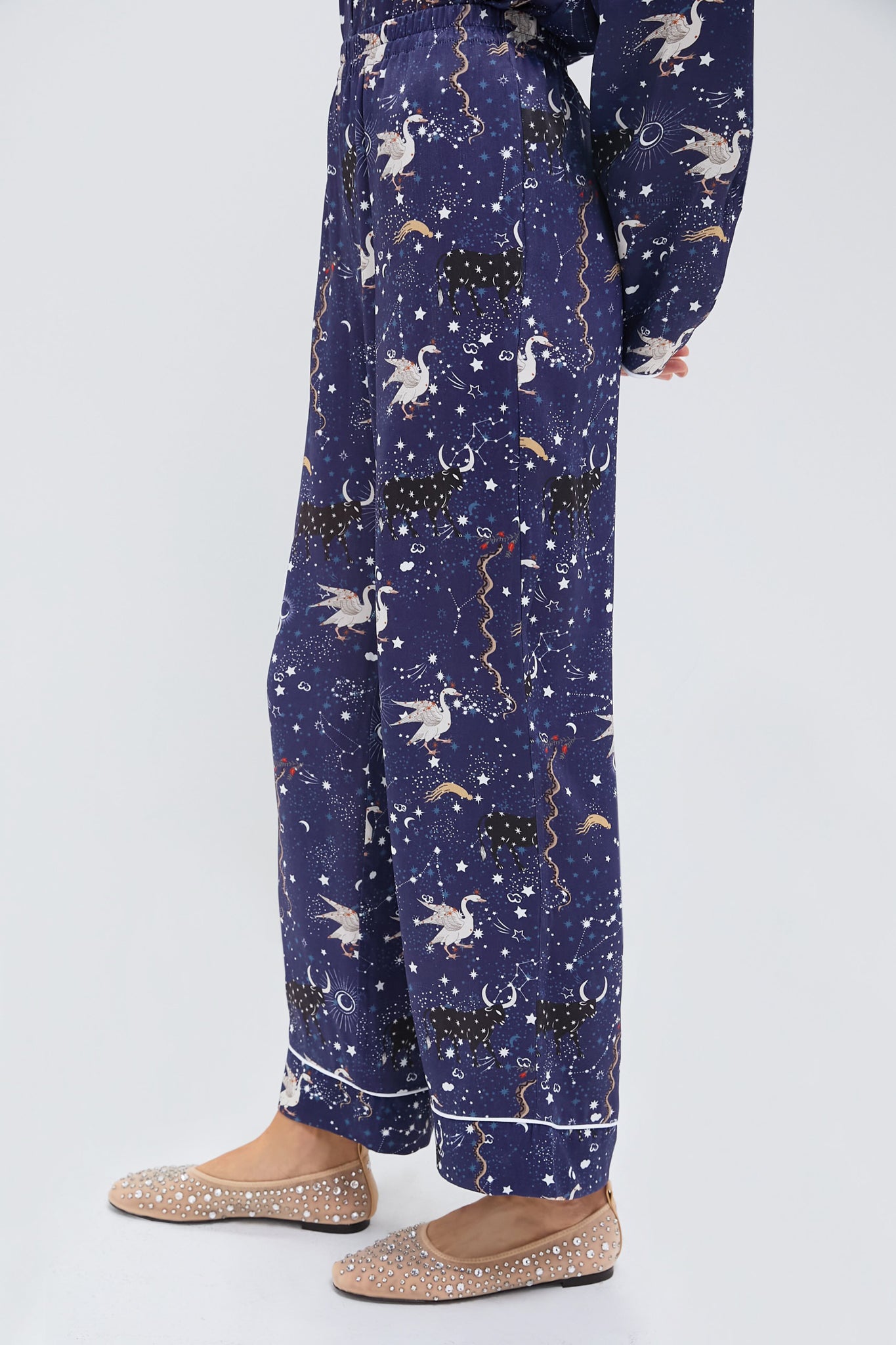 The enchanting astrology print on these relaxed pants. created by Milan-based print artist Julia Gerasko. showcases an array of mystical animals and protective talismans. embodying the essence of cosmic themes and astrological symbols. With two side seam pockets. vertical pressed creases. and elegant contrast piping at the cuffs. these pants are ideal for pairing with the coordinating Navy Mystic Print Pastelle Oversized Shirt for a complete look.