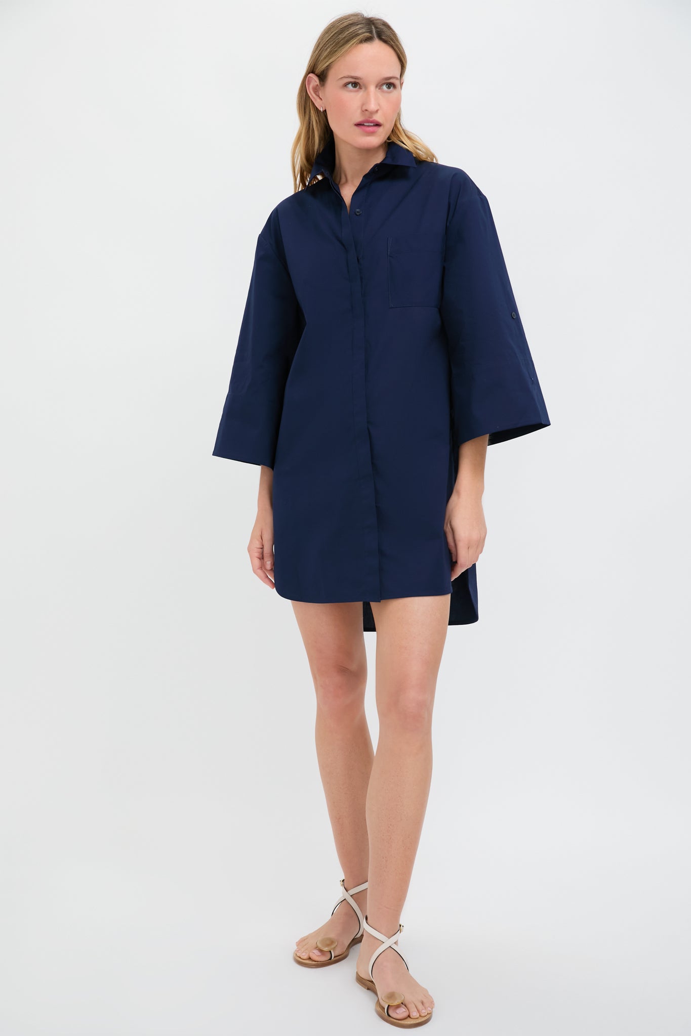 The Navy Nico Dress is an oversized shirt silhouette with wide cuff-able sleeves. a front button placket. a front chest pocket. and a high low shirttail hem. Sophisticated yet edgy. this eye-catching style can be dressed down with sandals and a tote or dressed up with statement jewelry and flats.
