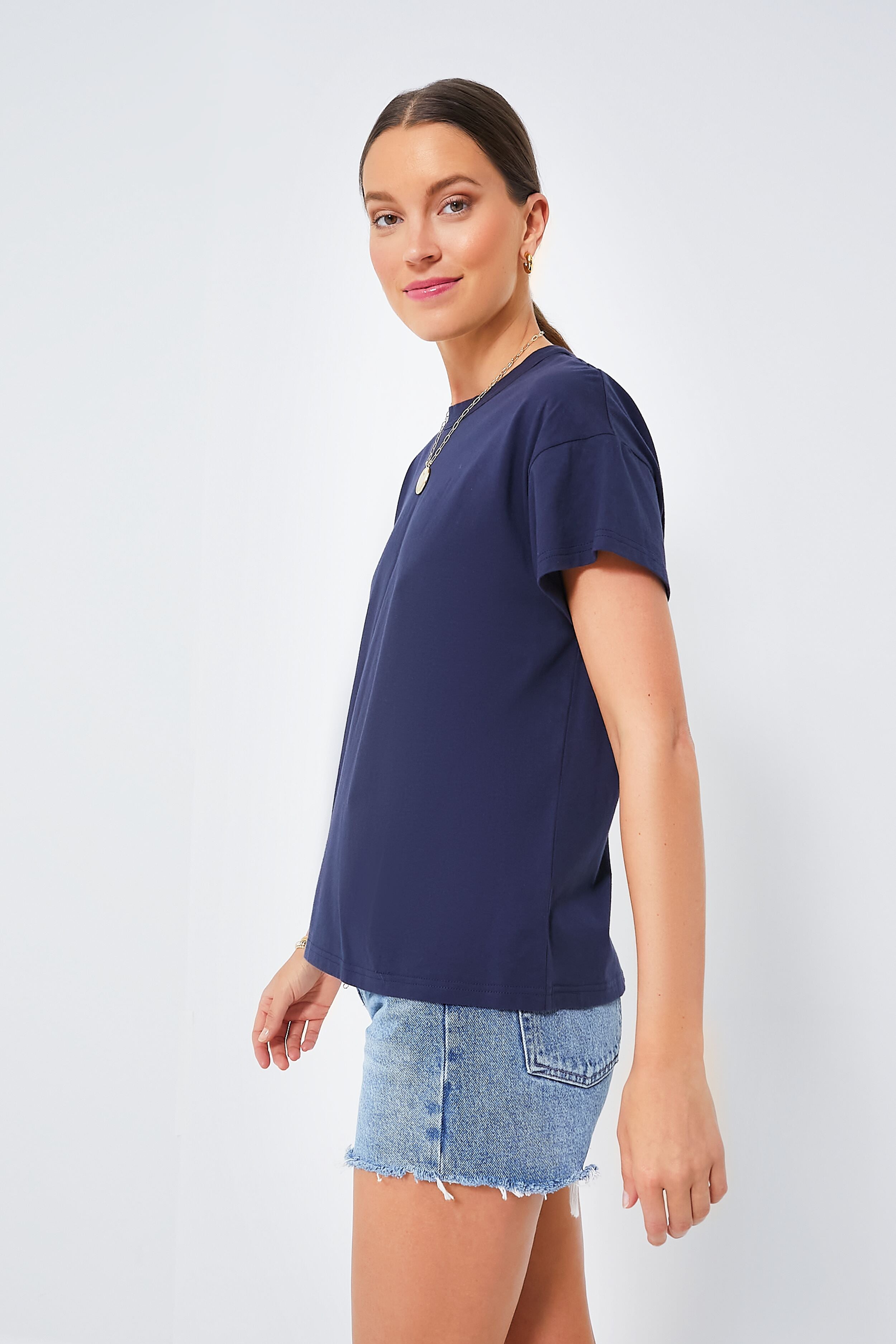 In search of a traditional tee that stands the test of time? Look no further than the Julia. Featuring a crewneck. short wide sleeves. and a relaxed fit that can be tucked in or out to achieve any look. this navy top is for those days when you just don't know what to wear. Throw on a pair of denim. a mini skirt. linen trousers– you name it– the possibilities are endless for this classic wear everywhere number.