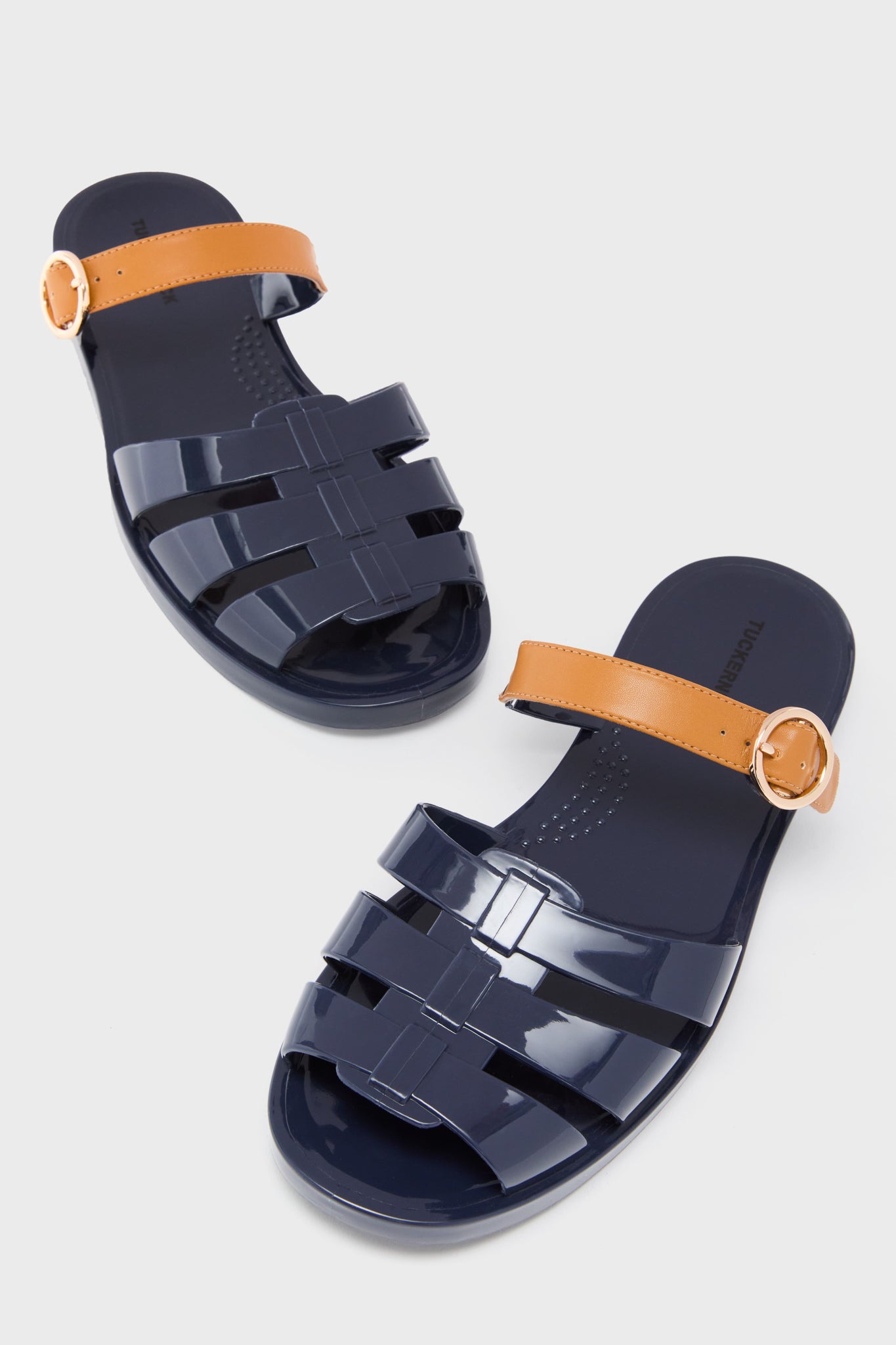 Inspired by the vintage style we all know and love. the Riley Jelly Sandals are an elevated upgrade. These slides feature a fisherman style toe with an adjustable leather arch strap. Easy and effortless. we are pairing these with denim shorts and a tee for weekend lunch or with a bathing suit on our way to the beach.