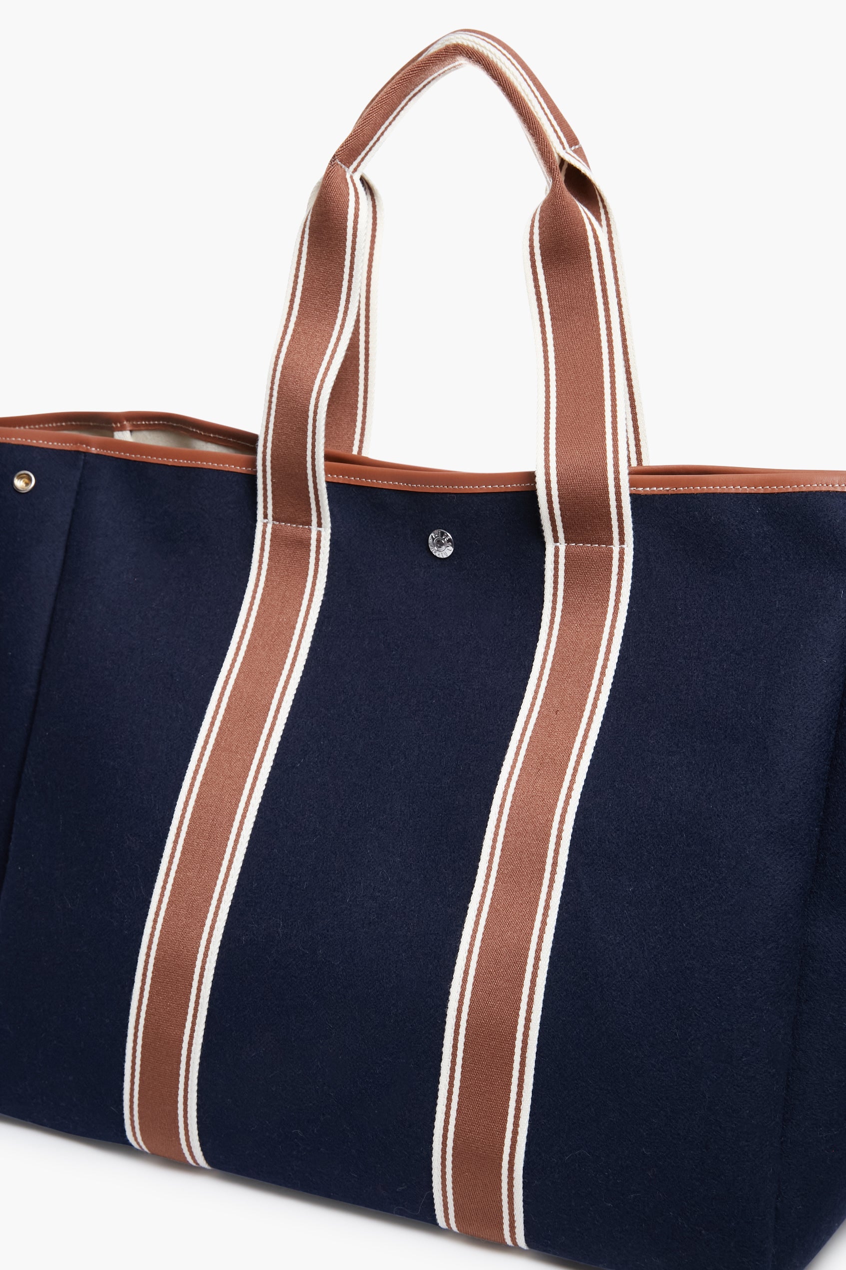 The Navy Traversee L Flannel Cruise Tote provides all of the space and style you need for an everyday work bag or for an upcoming weekend trip. Crafted from a luxe wool flannel with sturdy yet chic contrast top handles. this bag will stick with you for years to come. With silver hardware and a detachable strap. you can wear this versatile style on your shoulder or carry it by hand. Perfect for a quick getaway or a busy day running errands. this tote will make bustling around just that much easier.
