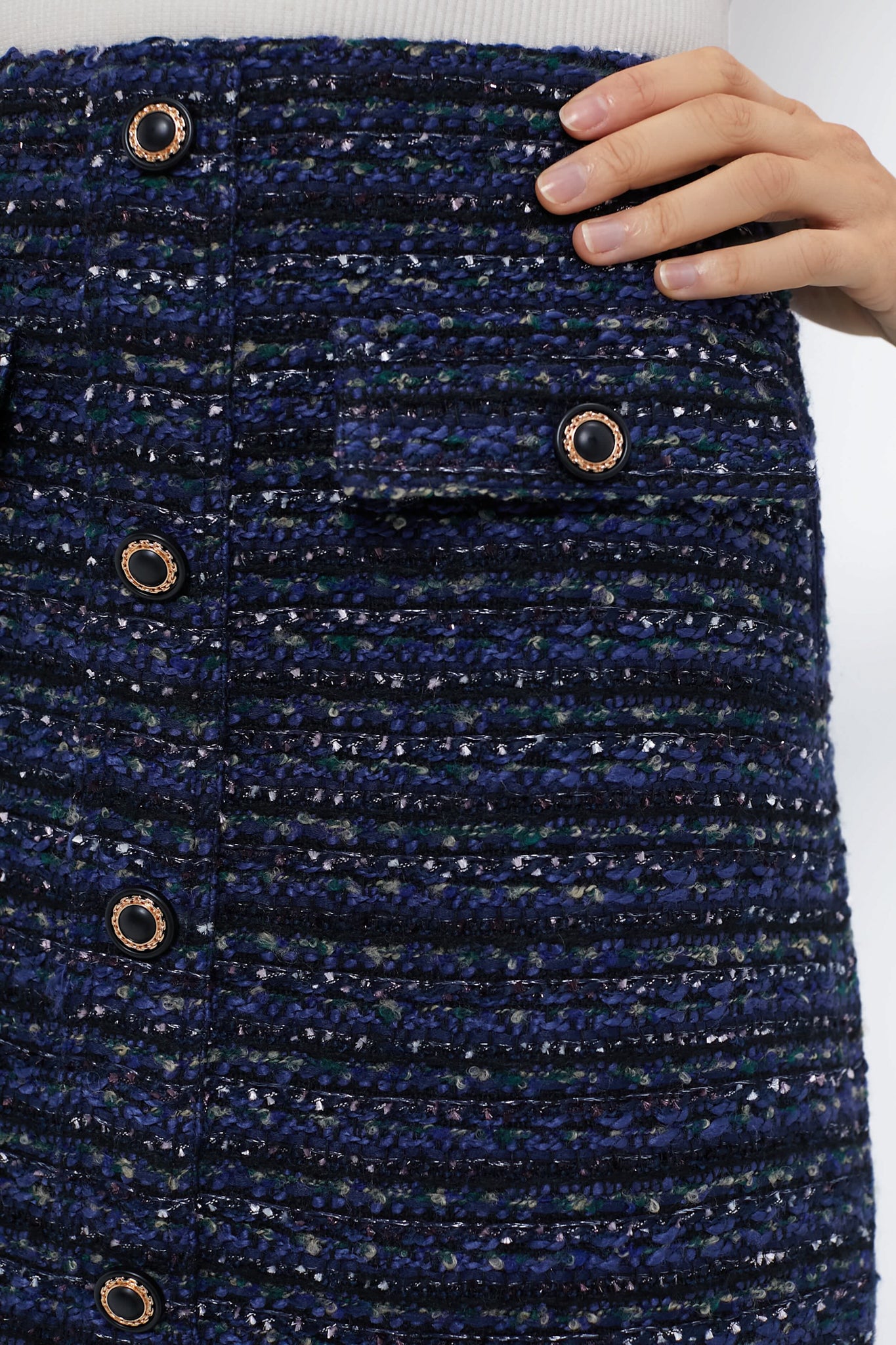 The Greer Skirt is a feminine look made from a luxe navy tweed. With sophisticated details such as the front button detailing and front flap pockets. you are sure to impress in this style. Pair with a white button down and boots or with the matching Navy Tweed Georgie Top and heels!