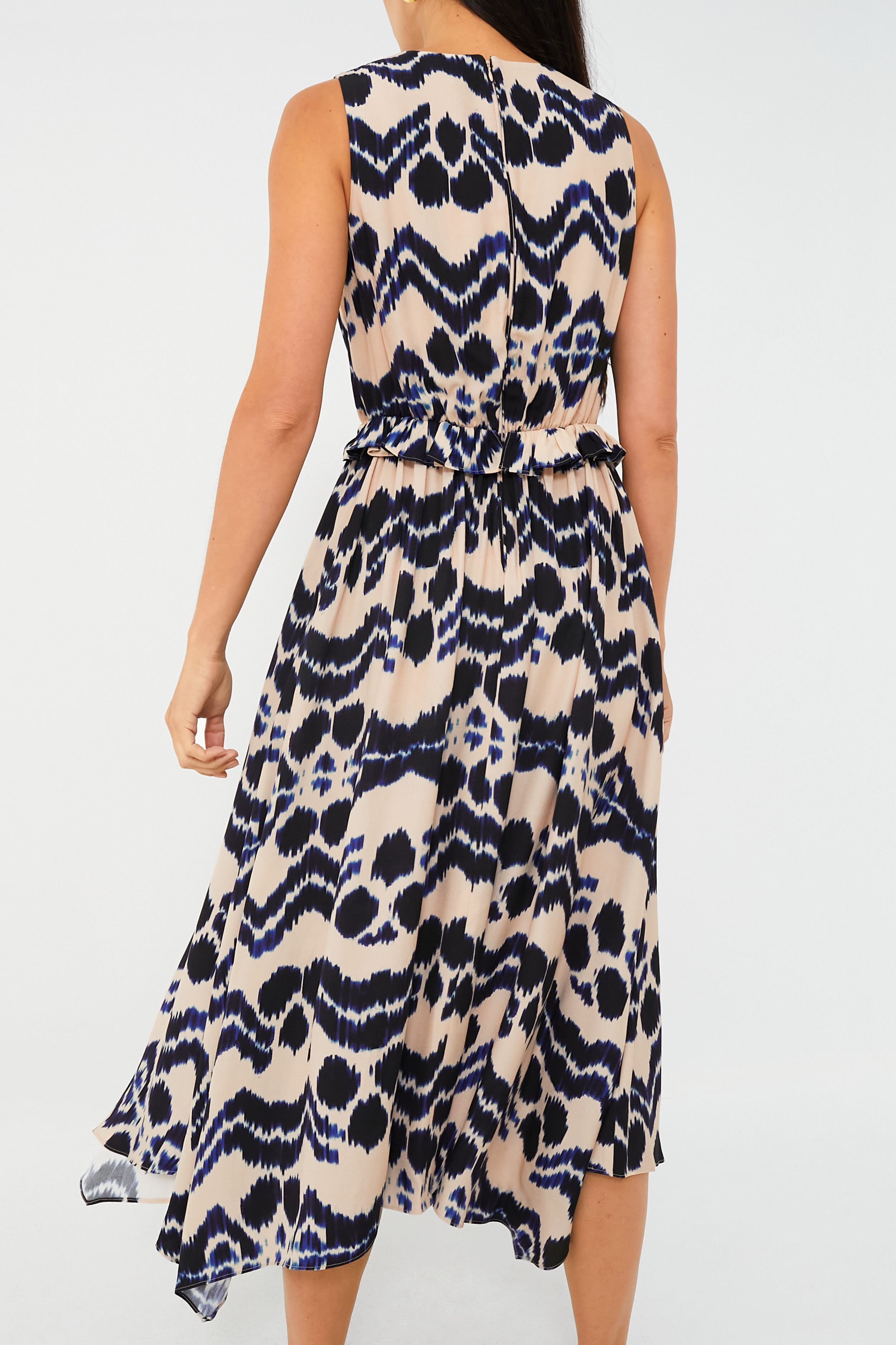 In an ikat-inspired abstract print consisting of beautiful inky shades on a creamy backdrop. the Nimbus Evita Dress is all kinds of elegant. Subtle in silhouette with a classic round neckline and a sleek and simple bodice. this midi gets all of its gorgeous movement from a ruffle-trimmed waist and an asymmetrical handkerchief hem. Complete your look by adding wedges and gold jewelry for an event-ready ensemble that is sure to earn you some compliments!
