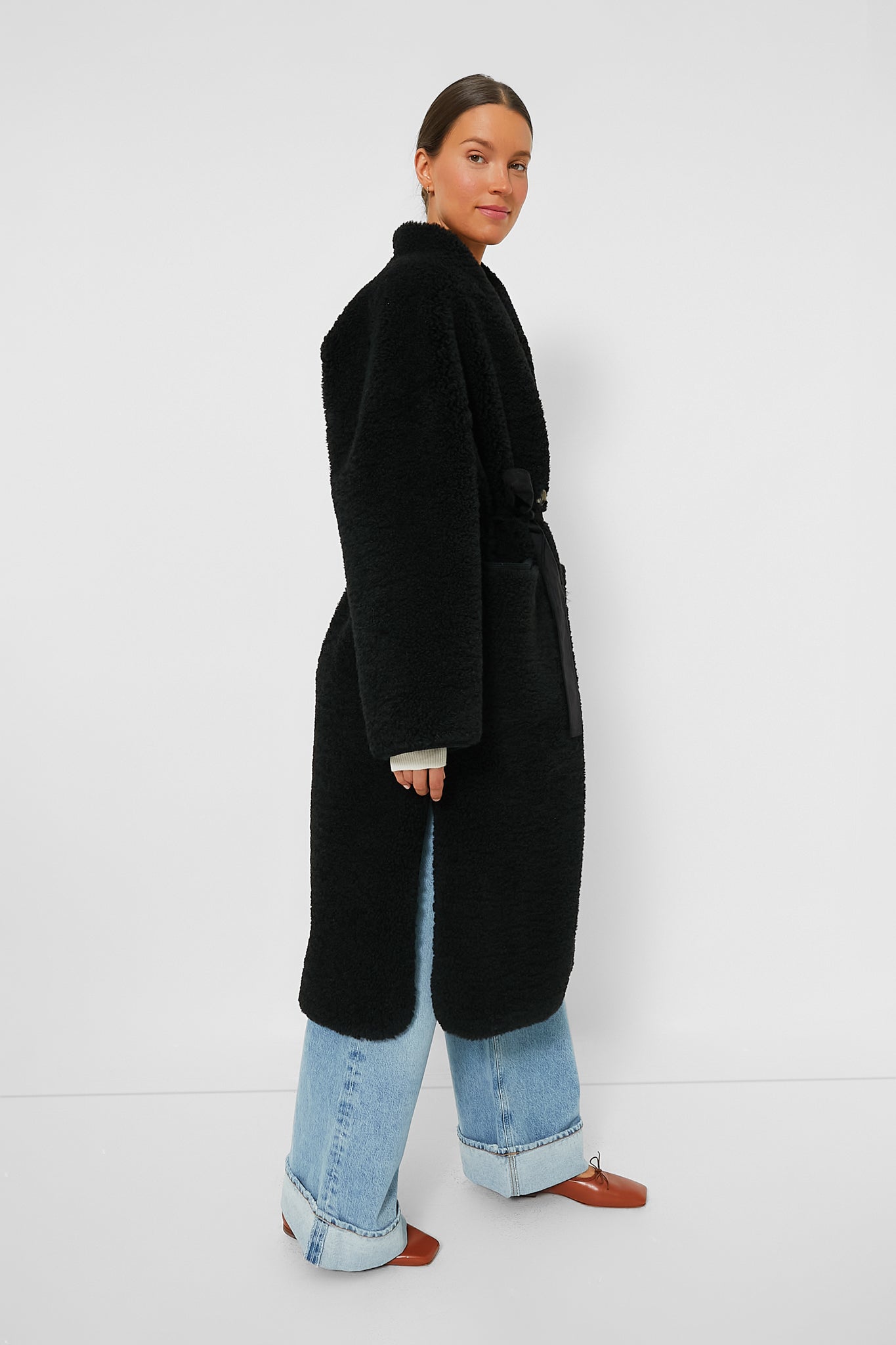 The Noir Bachir Coat is a luxe layer in a timeless hue that will complete any cold-weather wardrobe. Cut from warm wool blend with fuzzy texture. this stand collar layer offers an easy drape that compliments the oversized fit to create an ideal transitional layer. Add a beanie. boots. and sunglasses for a modern. city girl look.