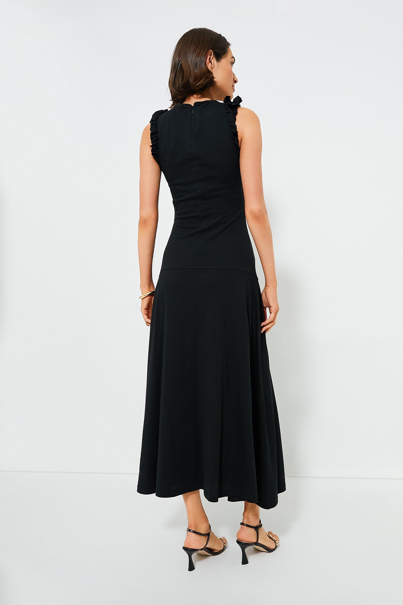 The Bendetta Dress is lovingly made from soft organic jersey that is as flattering as it is comfortable. Arriving in timeless black. it has ruching that sculpts the form and is embellished with romantic. raw-edge ruffles at the sleeves and front. It unfurls to a classic midi length and fastens with a concealed back zipper. Pair with glitzy jewels and high heels for a date night. dinner party. or evening soiree look.
