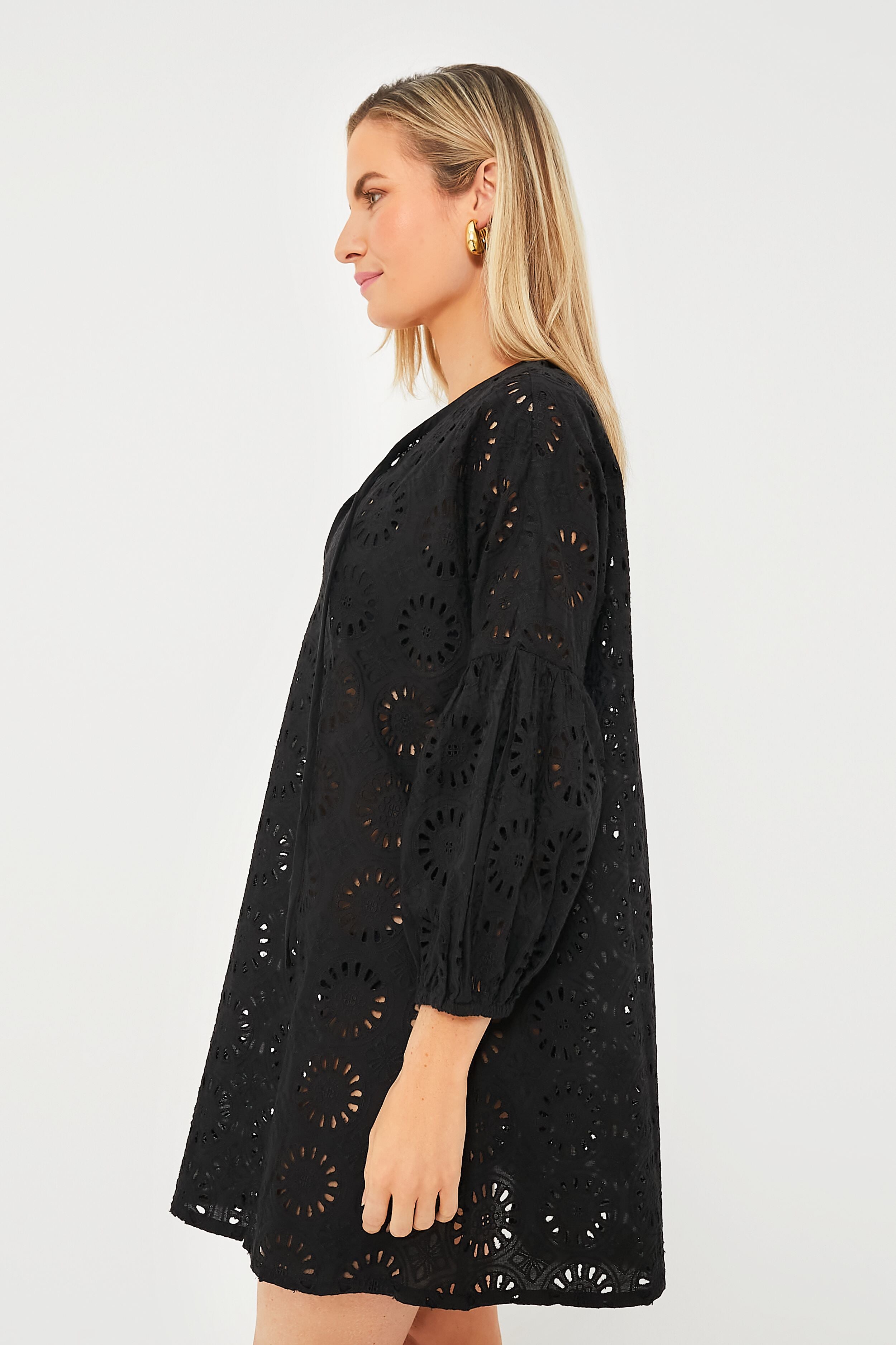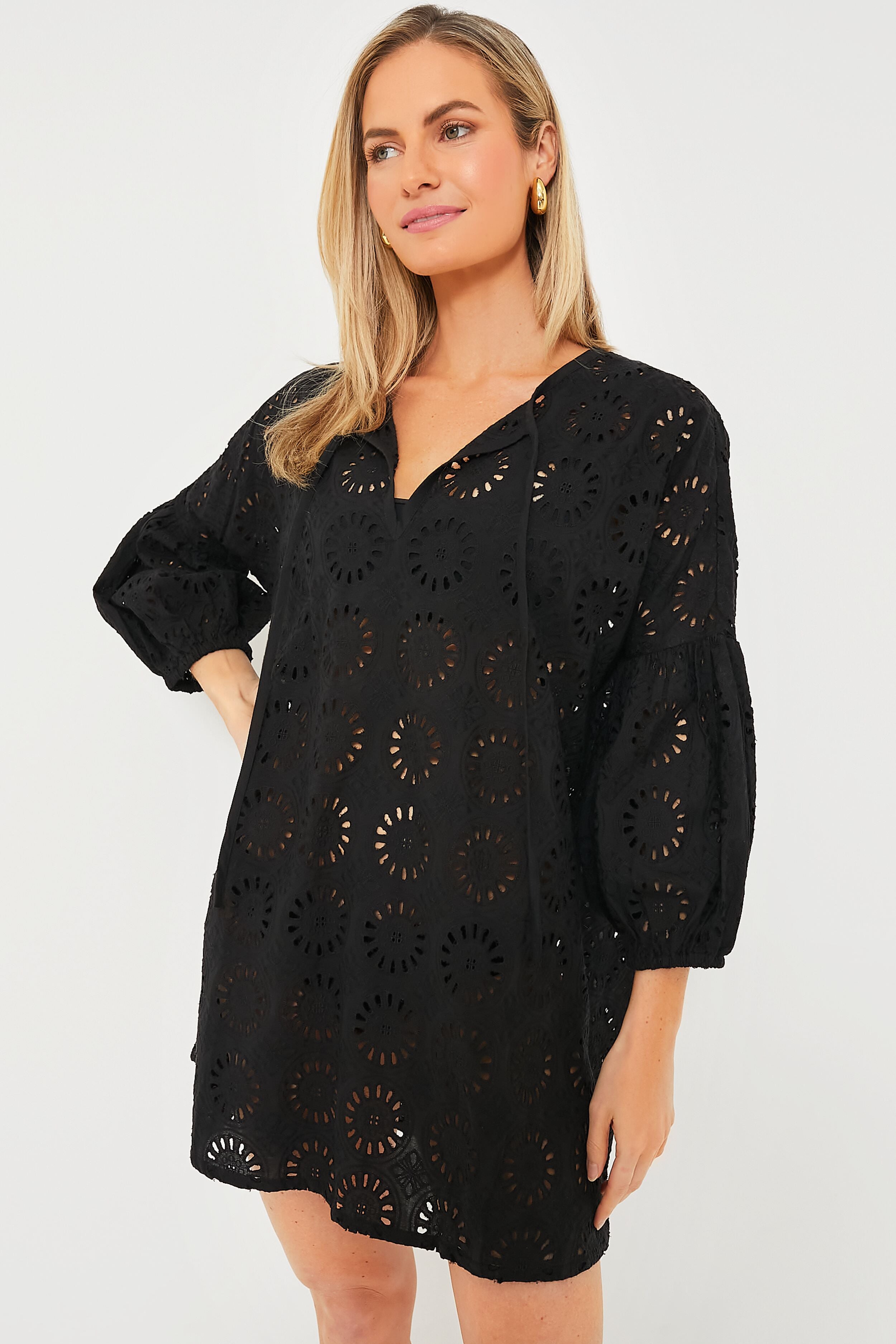 A classy style that can seamlessly take you from the beach to the bar. the Noir Eyelet Cleo Mini Coverup is an A-line silhouette that has long puff sleeves. a front tie closure. and a V-neckline. Unlined so you can let your bathing suit shine through. this is ideal for throwing on before a day of fun in the sun!