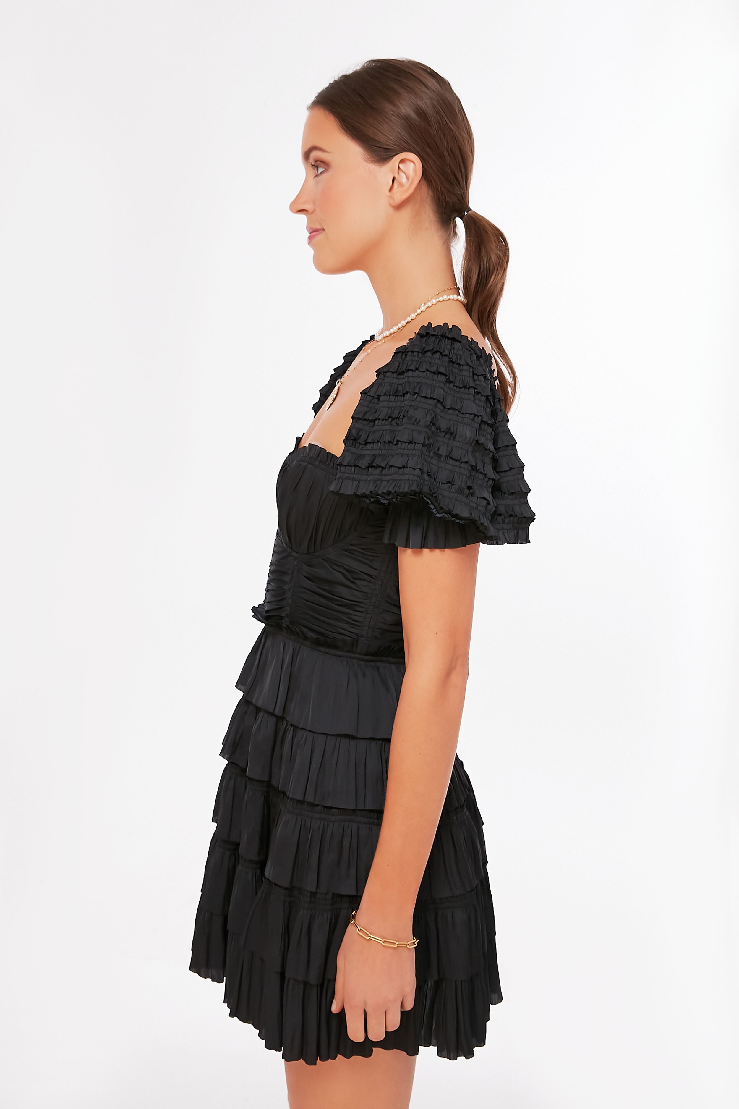 The Noir Lucette Dress is a sweet party-ready mini. Made from Ulla Johnson's signature plissé satin. this number features a corset-style bodice with ruched detailing and puff sleeves made from delicate ruffles. Ready to dance the night away. just add heels and a statement clutch for a twirl worthy moment.