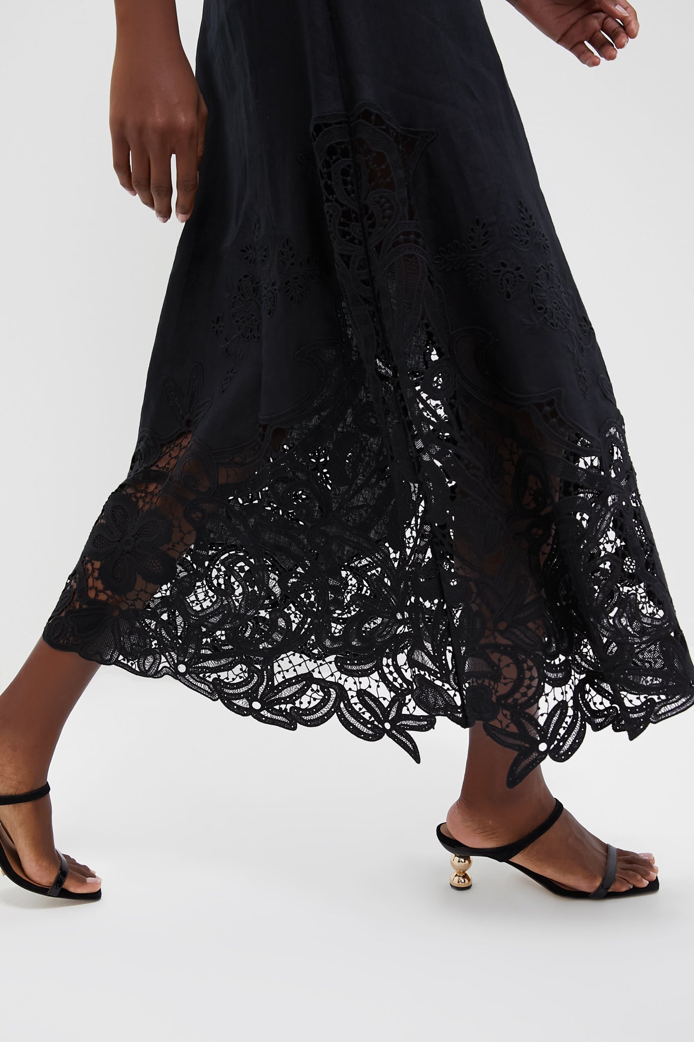 Effortless and romantic. the Olivette Dress is made from pure linen with intricate floral lace panels that are uniquely engineered to the silhouette. This sleeveless dress has a V-neckline and flows to an ankle-grazing hem that moves beautifully. Pair with neutral heels and gold earrings for the ultimate cocktail to date-night look.