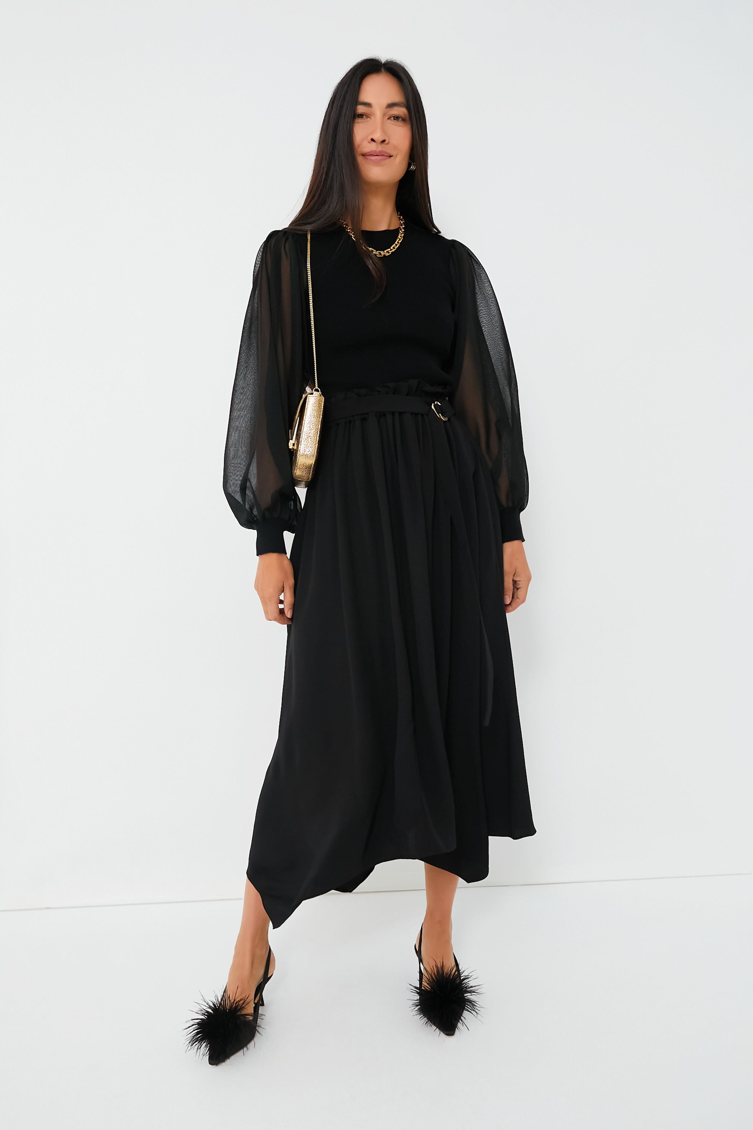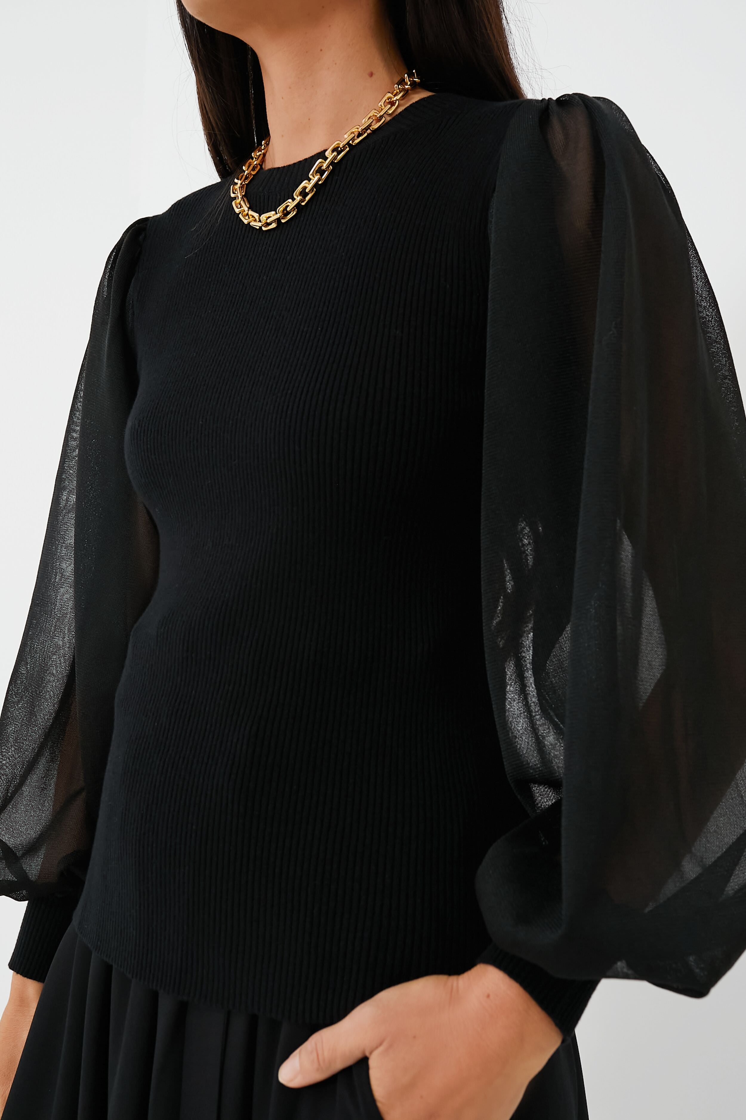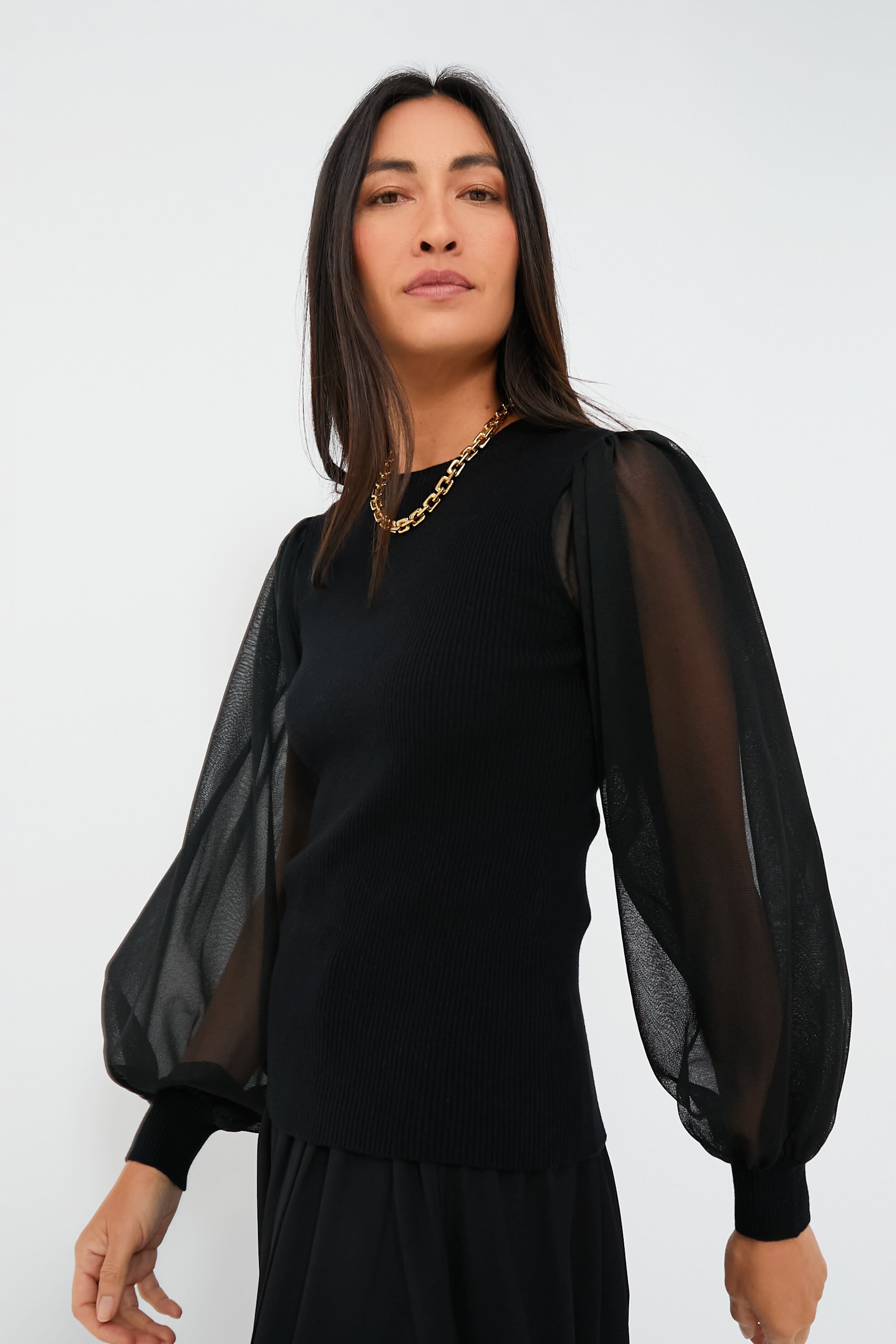 The Noir Sabrina Pullover is our favorite staple this season. Featuring sultry and sheer puff sleeves for a feminine touch. as well as a flattering knit bodice made from a luxe merino-wool blend. this top is fun. functional. and easy to style. Perfect for the office. dinner parties. and events alike. we are pairing this piece with midi skirts and heels. or with sleek denim and statement jewelry. for an elegant and elevated look!