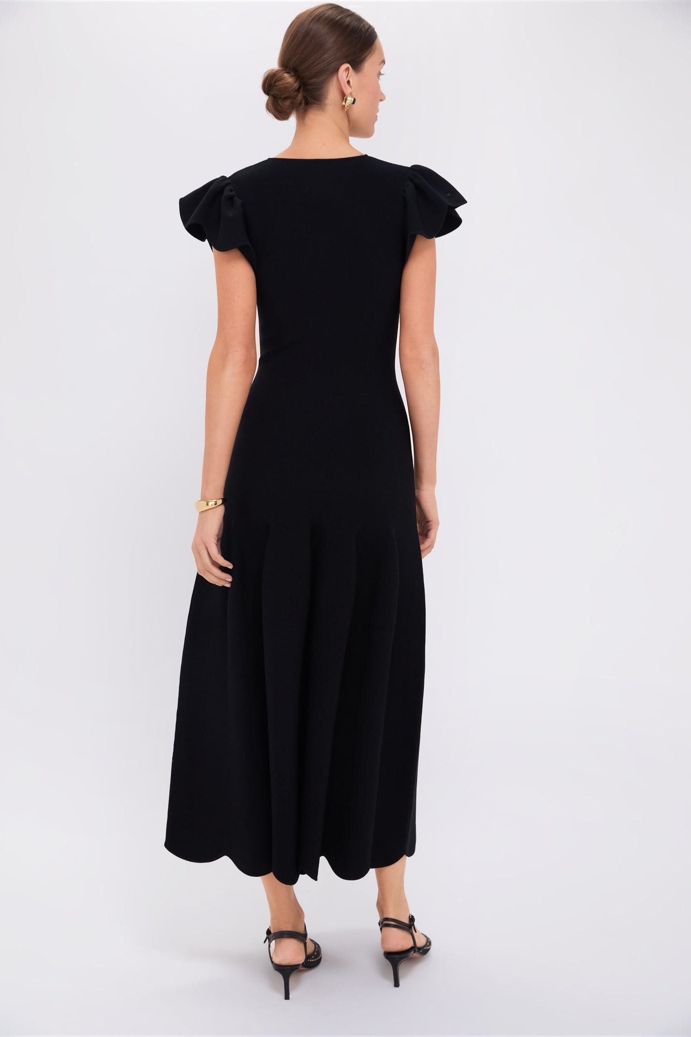 Sculptural yet refined. the Yvette Dress is artful designed with scalloping at the neckline. short sleeves. and hem—the edges are thoughtfully completed with micro binding for a clean and elegant finish. This black dress nips in at the waist and has a classic A-line skirt. Perfect for your next special occasion. pair with black heels and a clutch for the perfect look!