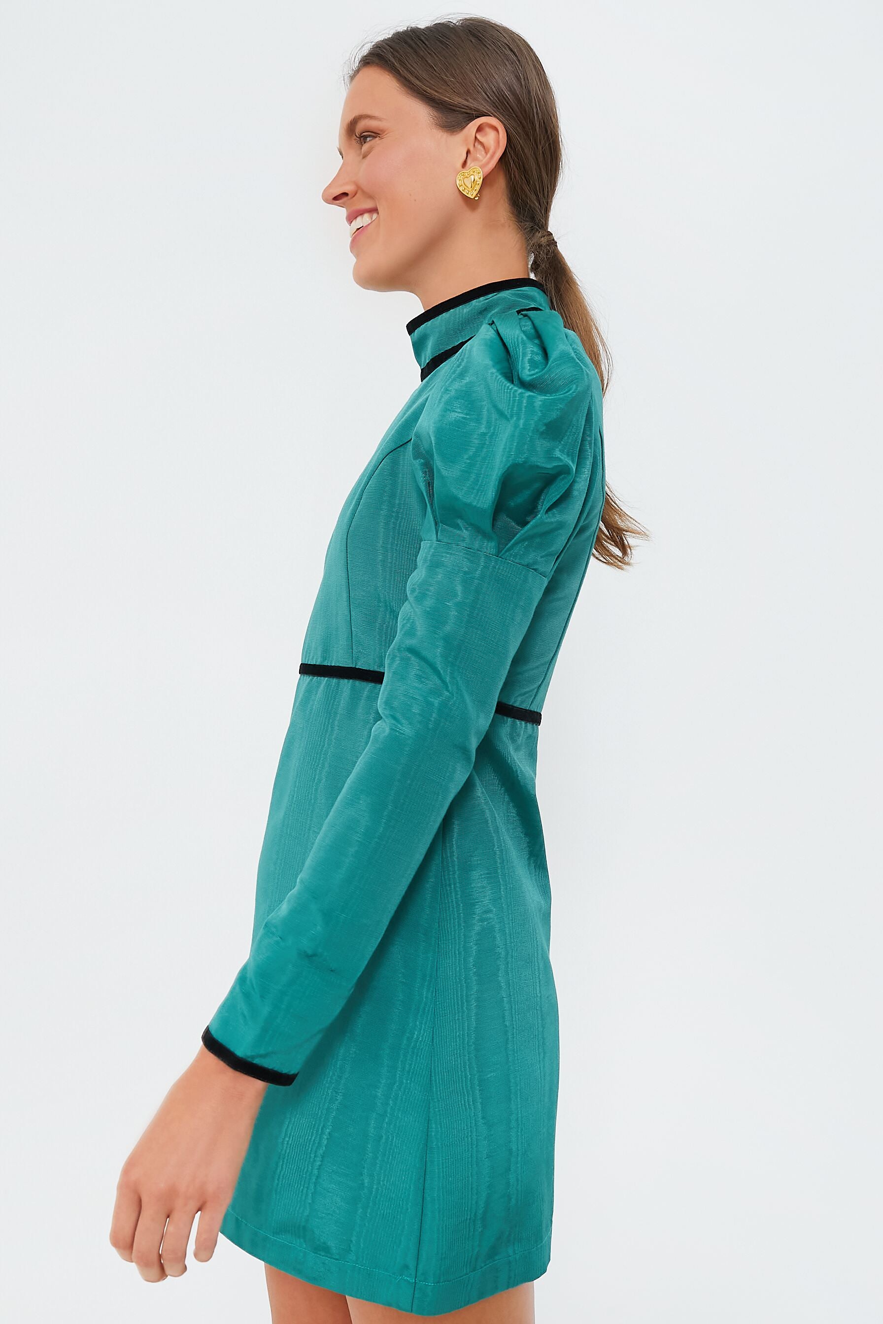 We always have room for one more mini in our closet! The Ocean Tate Dress is beautifully crafted in a striking green hue with a woodgrain moire finish and velvet trim detailing. This fun and funky silhouette features a mock neckline. puffed shoulders. and a back zip closure for easy styling — just pair with pumps and statement earrings for a fun girls night out look. or with flats and gold hoops for a retro-inspired date night ensemble.