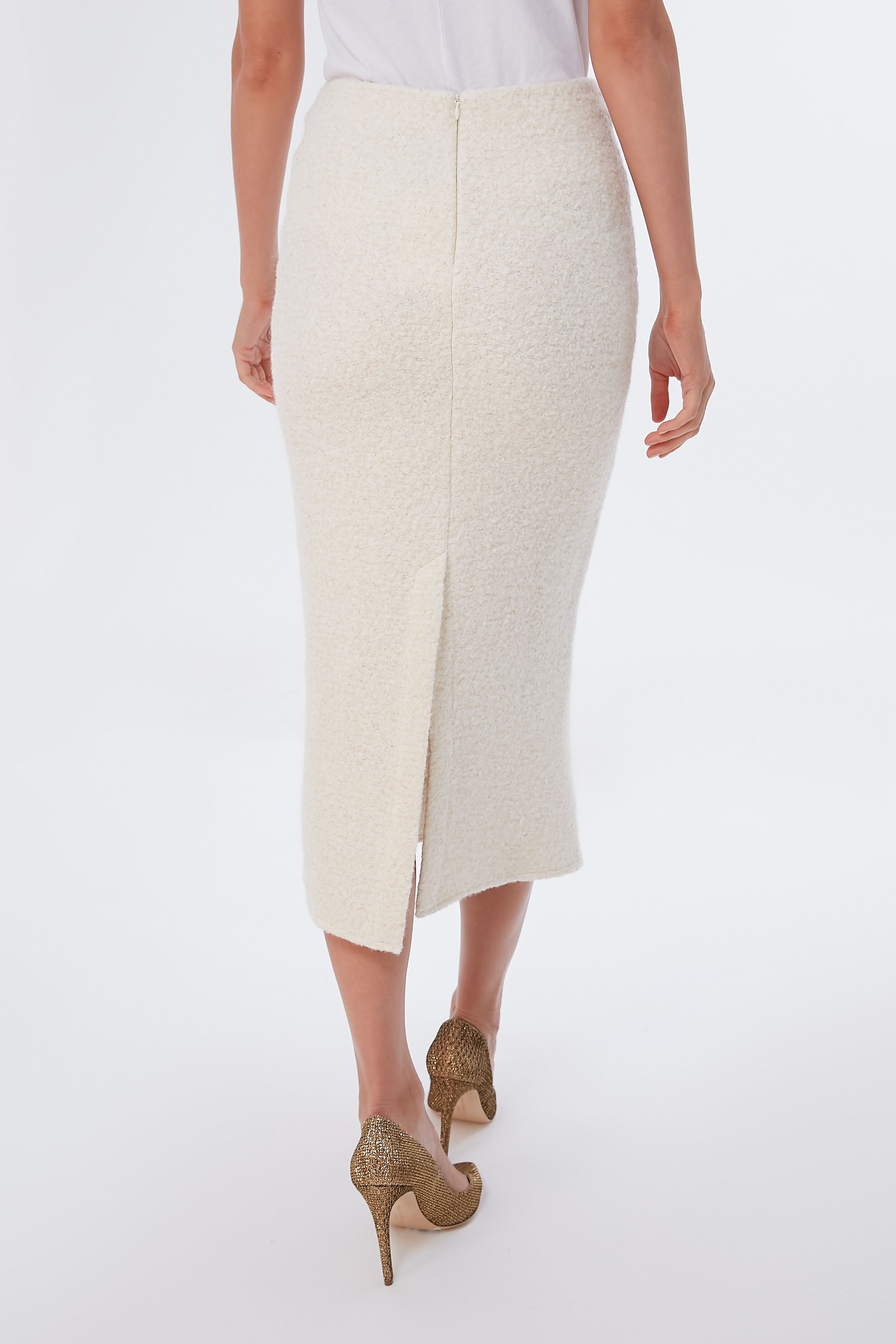 The Off White Camille Sweater Skirt is an elegant. sophisticated silhouette with a hint of vintage inspiration. Featuring a high-waist for a flattering fit. and a back vent that allows for comfort and flexibility. this classic midi is meant to have a place in your closet. Pair it with the matching peplum top for a monochromatic moment. with a blazer to the office. or with bold accessories for a party-ready look that comes together in no time.