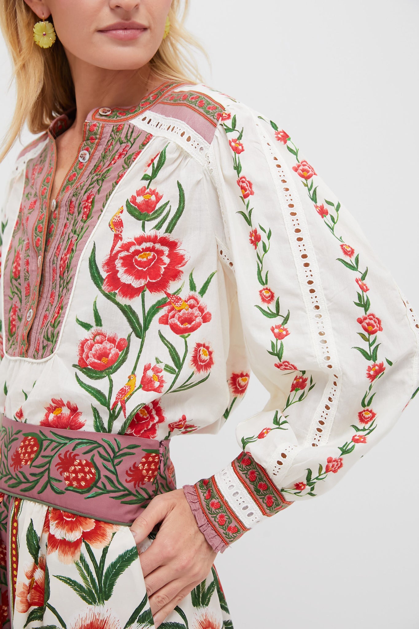The Off White Delicate Ainika Blouse features beautiful floral print with intricate eyelet embroidery that create a stunning silhouette. Perfectly crafted to make you stand out. we are styling it with the matching Off White Delicate Ainika Midi Skirt and heels for a chic set.