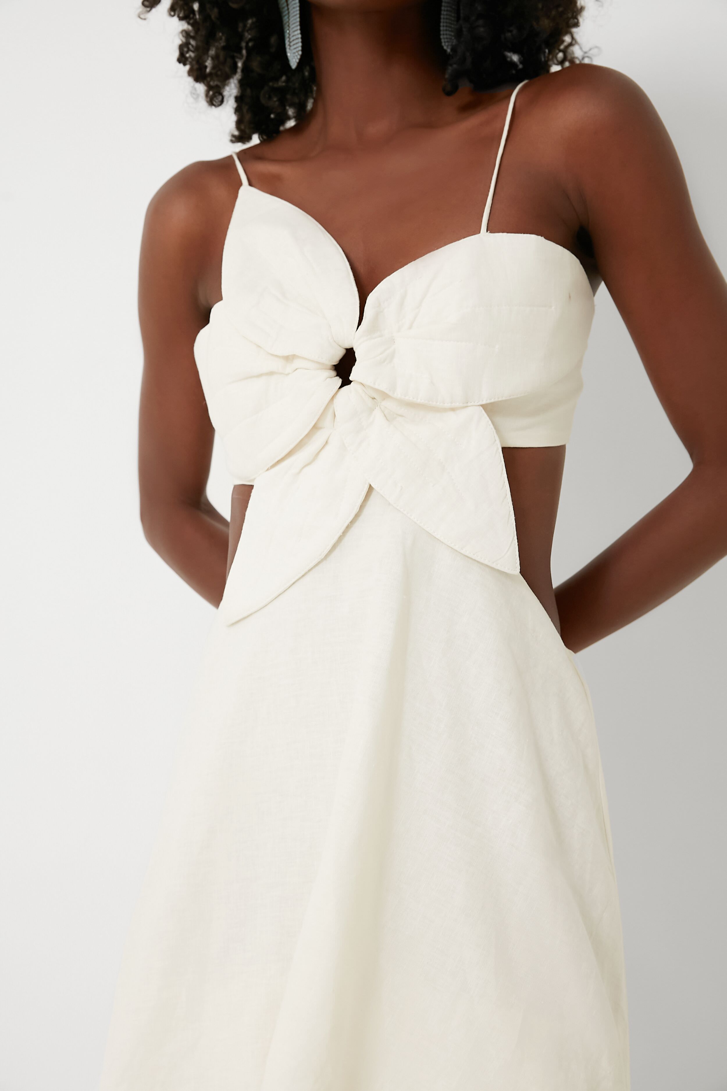 Elegant and elevated. we can't get enough of the Off White Flower Maxi Dress. With delicate adjustable spaghetti straps. petal-like accents on the bodice. and side cutouts that lead to an open back. this breathtaking maxi does not skimp on the details. Made from a light and airy linen-viscose blend with a layered tiered skirt that was made to float on warm breezes. you will reach for this silhouette for everything from evening events to romantic dinners — just pair simply with heels and gold jewelry and let this special style take the lead.