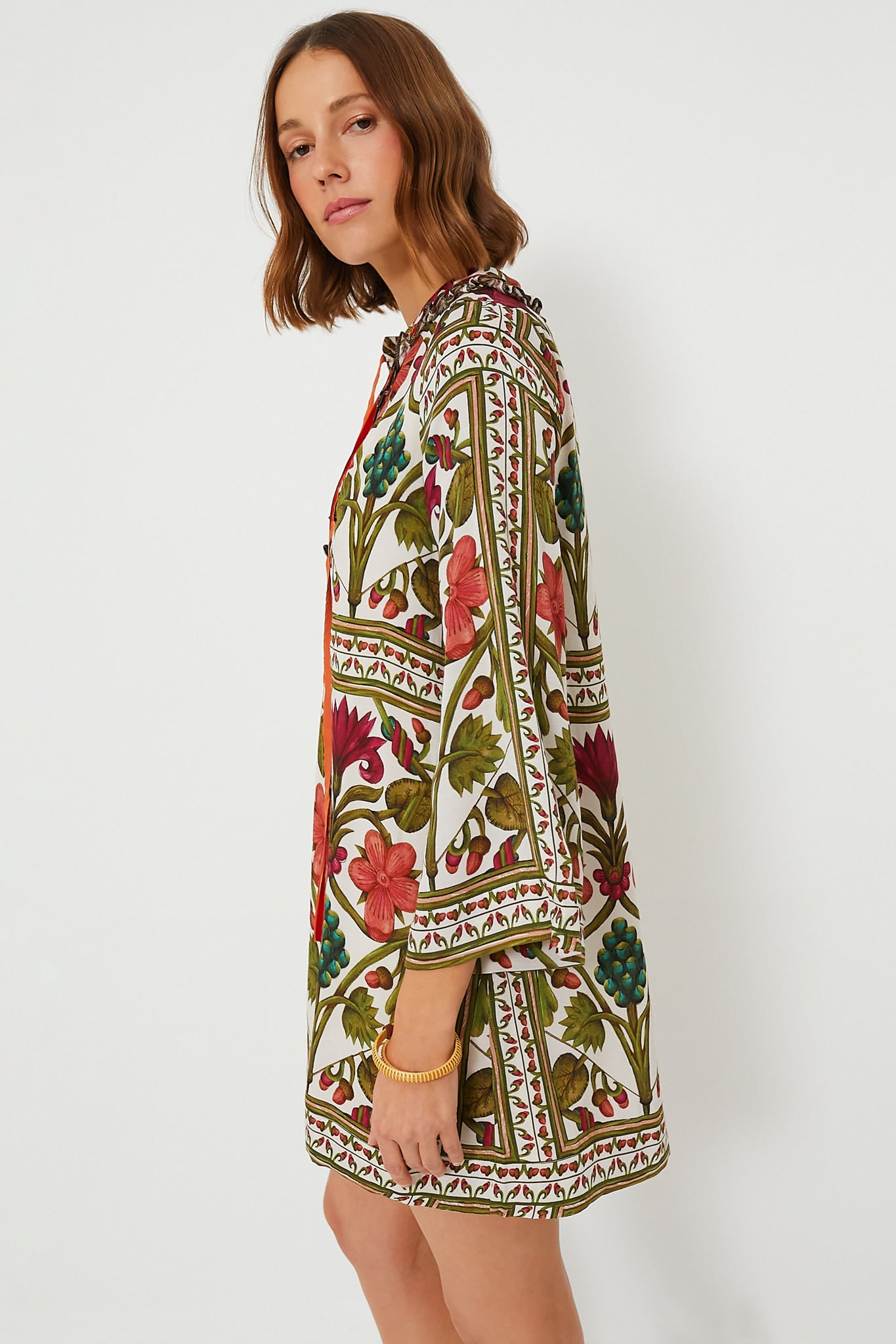 Our Tess Short Dress is made to wear joyfully at midday gatherings and soirées alike. The combination of the mini length with long bell sleeves adds an extra allure to the wearer. and the vibrant pattern is the cherry on top! It can be worn on its own as a dress or as a tunic with the matching Off White Multicolor Maria Pants!