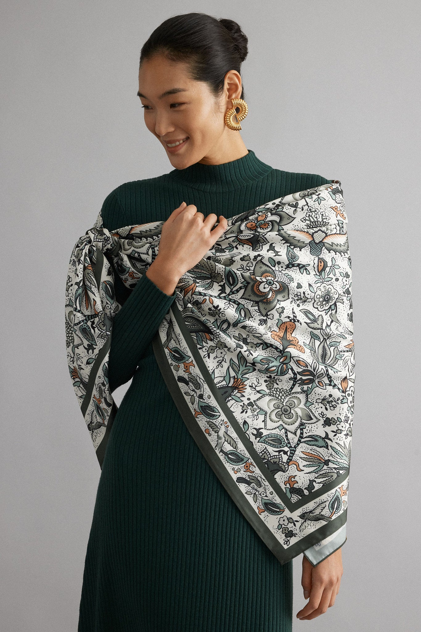 There's nothing more wearable—or chic—than a printed silk scarf. Crafted from luxurious flowy fabric. this style is versatile enough to be tied around the neck. worn over the shoulders like a shawl. or even tied onto a handbag. For a bonus. style it with our Gold Scarf Ring for a stylish touch.