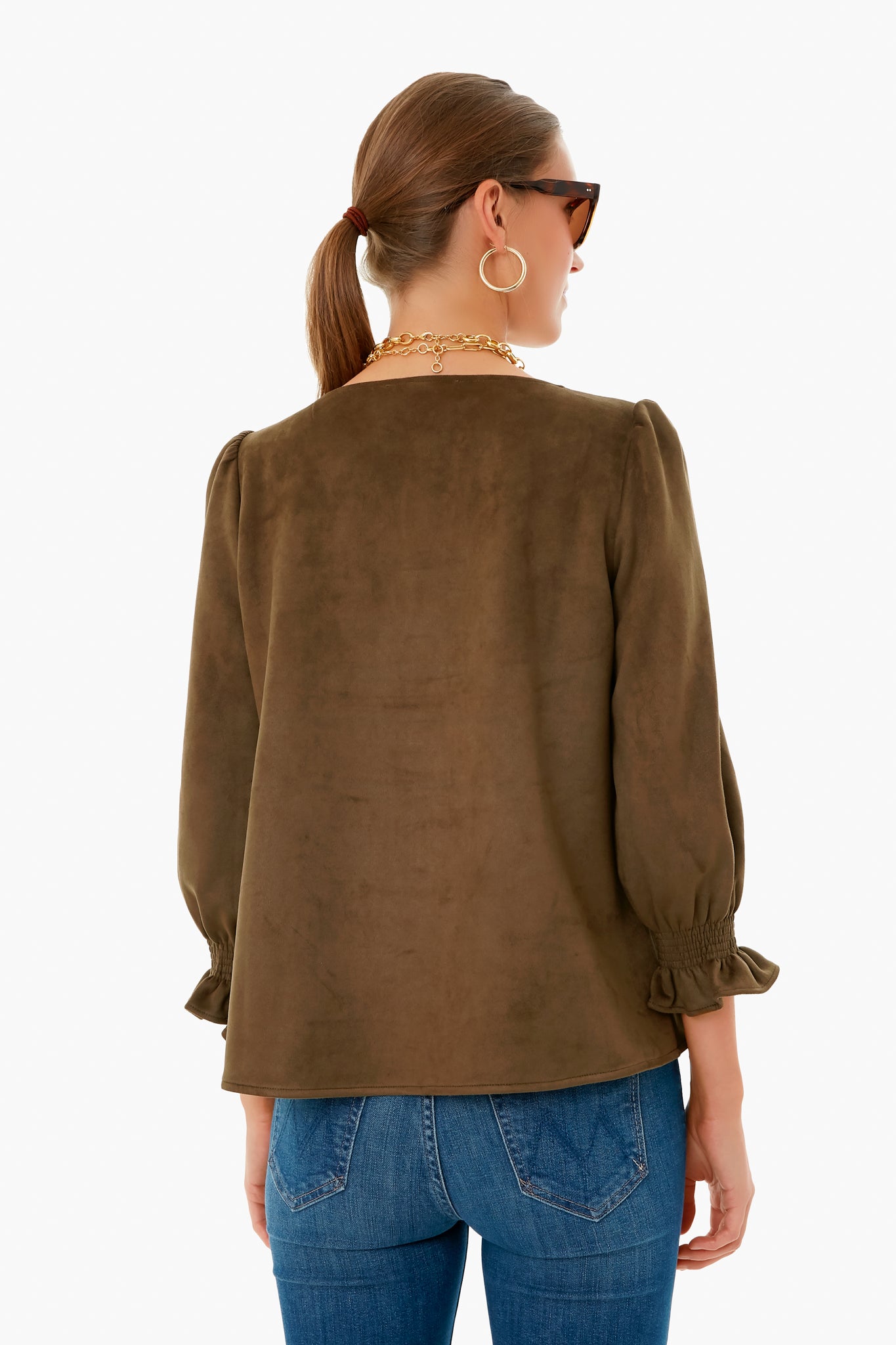 We combined our best-selling Easton Blouse with an updated olive suede. making it perfect for the months ahead. Simple with an unexpected twist. the Easton is detailed with flounce ruffle sleeves. a flattering v-neck and an all-over textured material. Classic and feminine. we are pairing this with jeans to wear from picnics with friends to game nights with family!