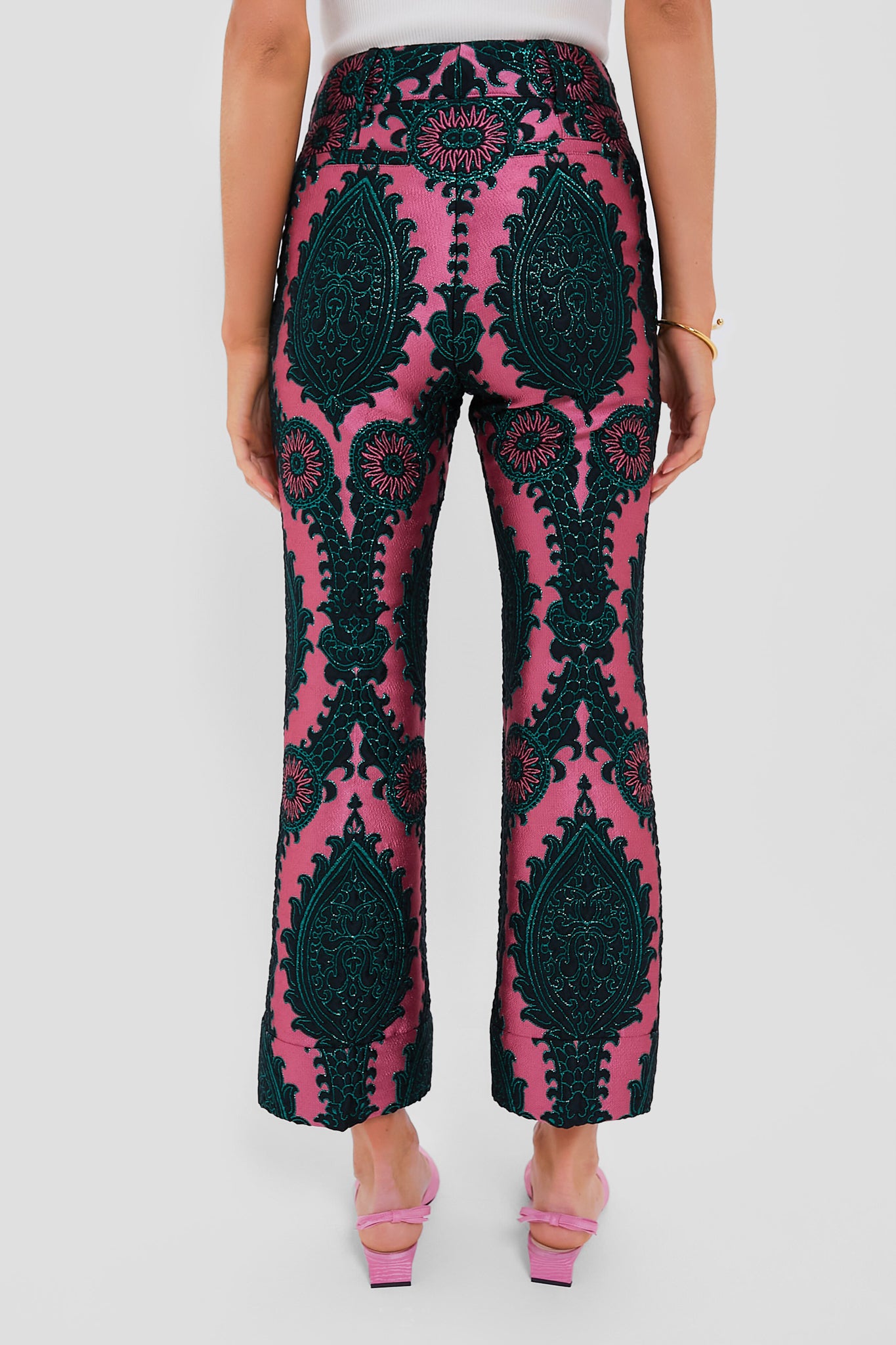 Crafted from a stunningly textured jacquard fabric. these Oltrarno Hendrix Pants are complete with a flattering high rise and a subtle flare at the ankles. boasting a figure-flattering fit perfect for everyone. Style with the matching Oltrarno La Scala Top with Feathers for a statement look that is sure to turn heads. or pair with a crisp white blouse for a slightly more muted look.