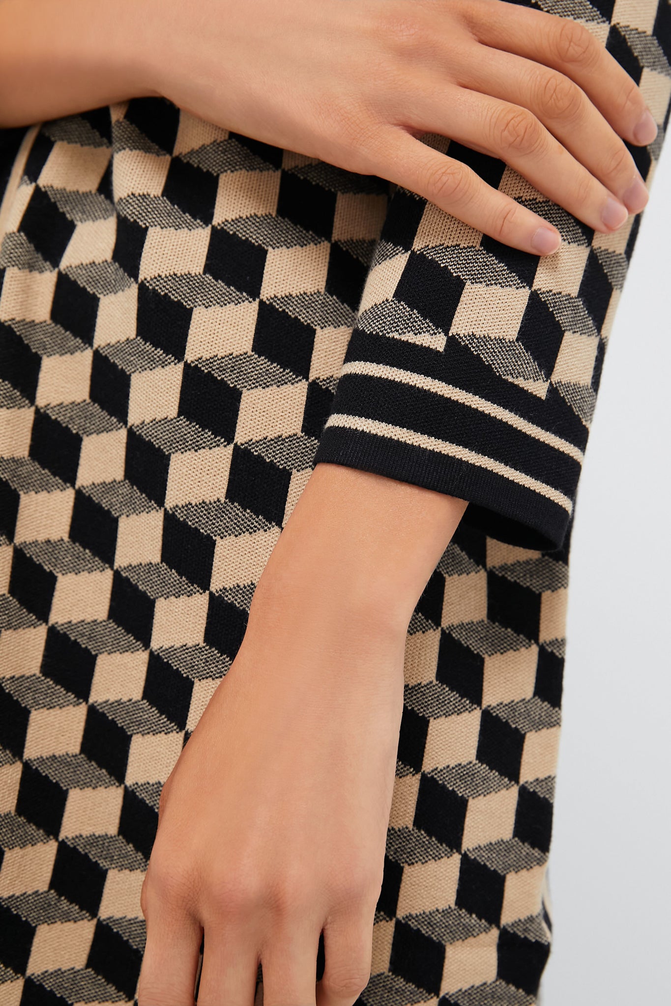 Crafted from a mid weight knit in an eye-catching geometric pattern. the Liv Cardigan offers a simple yet flattering silhouette with contrast stripe finishes and crested buttons. Lean into the vintage vibe by pairing this with a matching Onyx and Camel Knit Geo Marie Dress. tall boots and a shoulder bag for a chic ensemble.