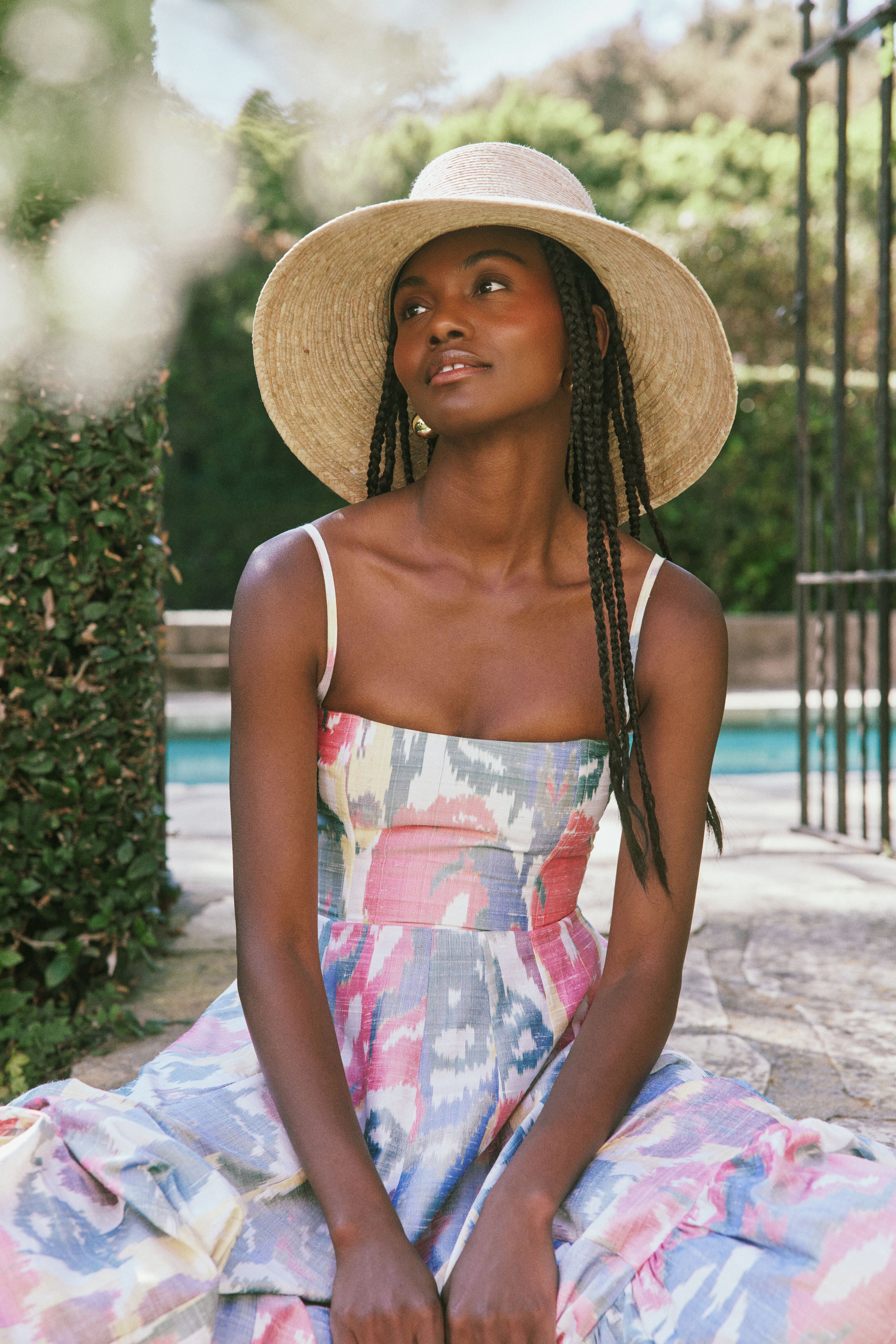 The Orquidea Dress is a stunning. stand-out occasion gown. Made from handloomed ikat silk. it features a flattering cinched waist. a corseted bodice. and removable spaghetti shoulder straps to give you a couple of different styling options. Colorful and fun. add heels and statement jewelry to dance the night away!