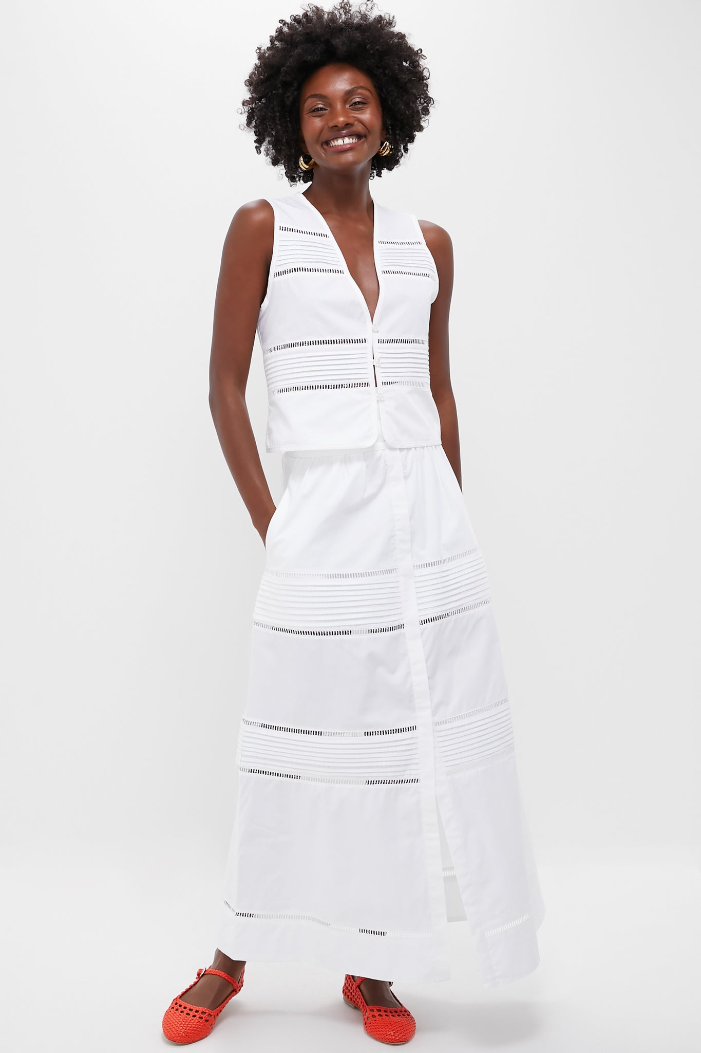 The Ostuni India Maxi Skirt is a chic skirt with a high-rise. wide waistband. and covered front button placket. With pleats throughout. this skirt is effortless chic and pairs perfectly with the coordinating Ostuni Giannina Top. Just add colorful flats and a bag for a cool girl. chic style!